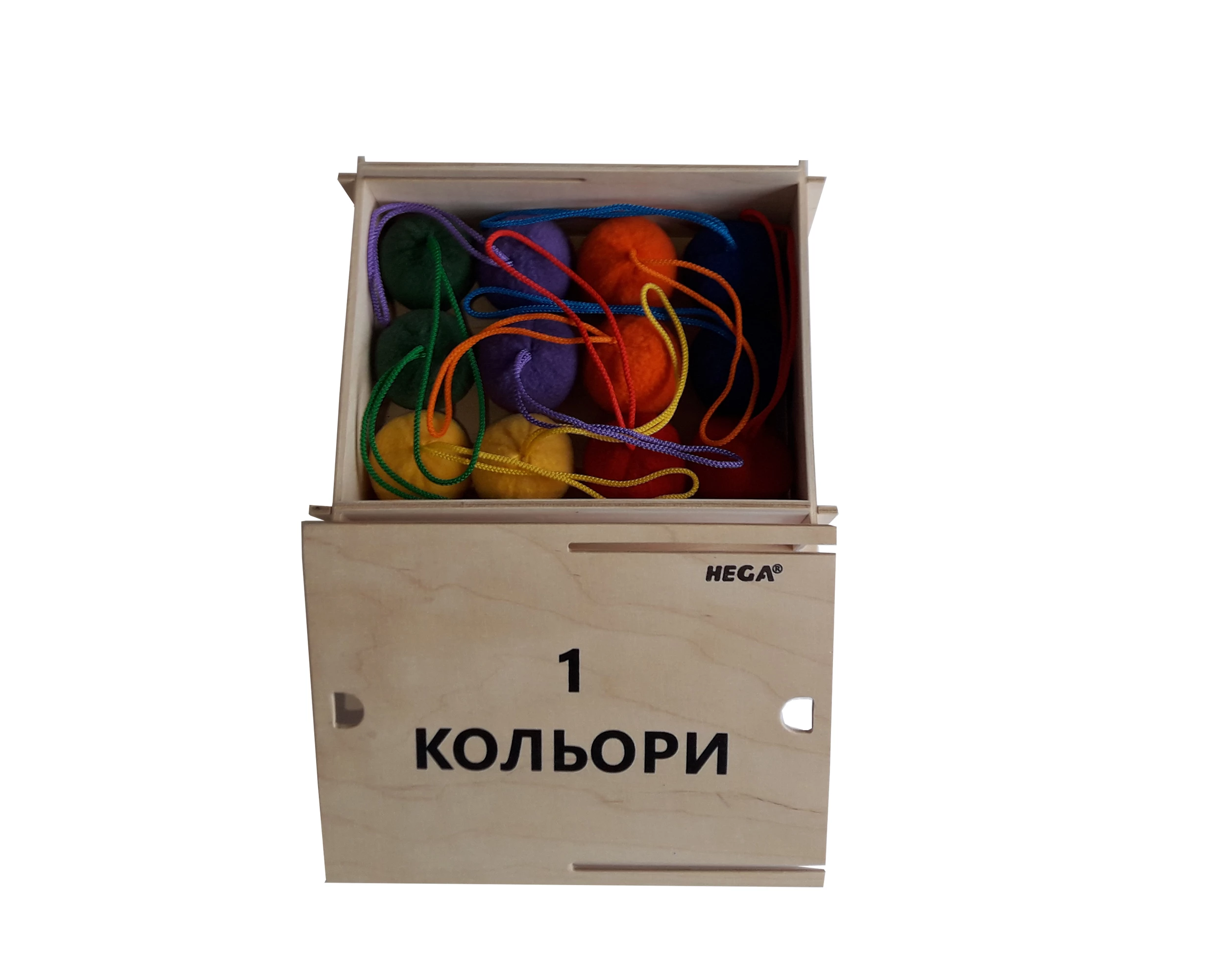 Набір №1 включає тактильні м'ячики на мотузочку, розміром не менше п'яти сантиметрів, виконані в різних кольорах.