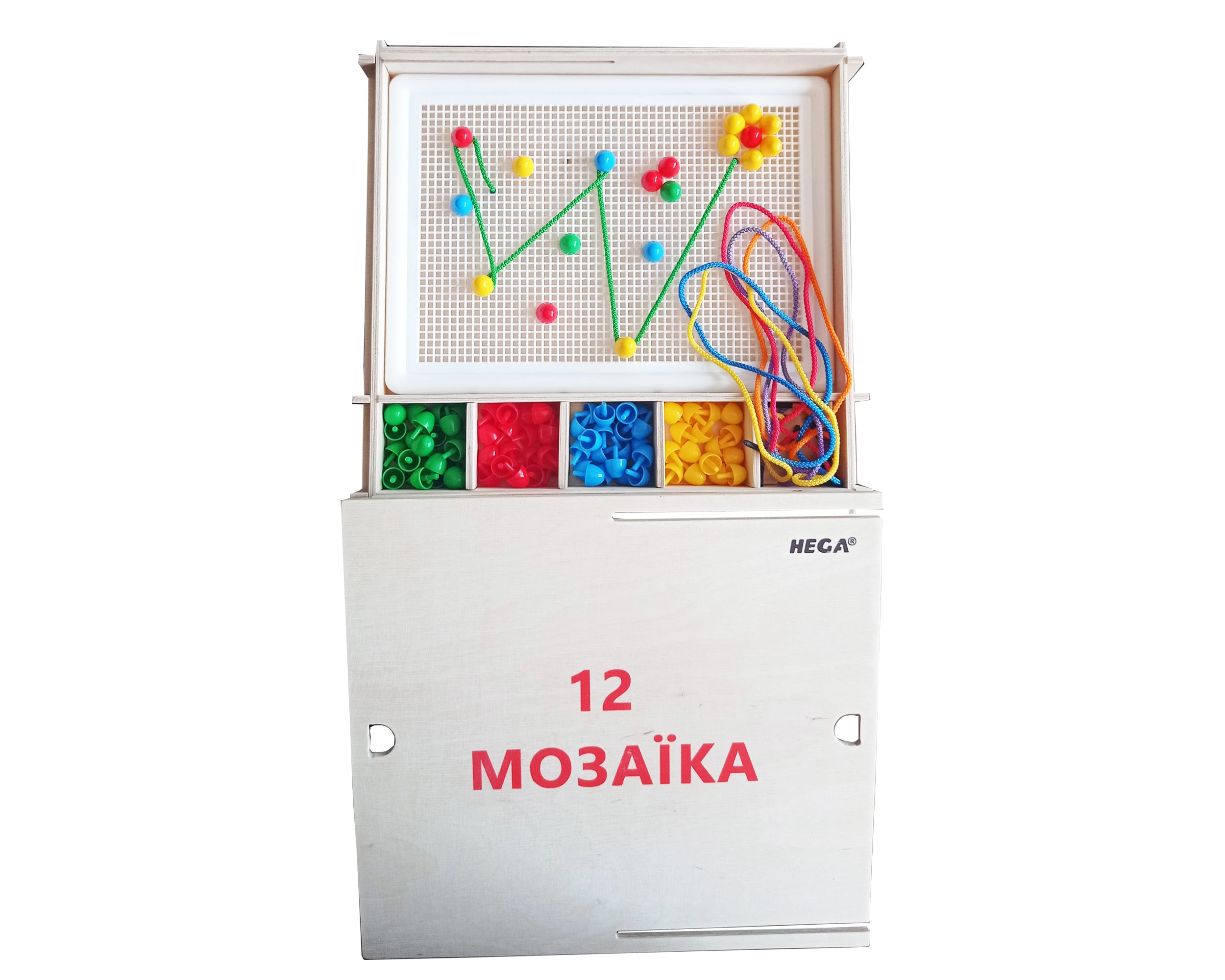 У коробці №12 міститься поле для мозаїки, 100 фішок та 6 шнурків.