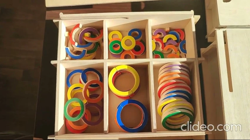 У комплекті №9 ви знайдете кільця та півкільця різних діаметрів. Півкільця одиничного діаметра збираються в кільце. Фігури вкладаються одна в одну. Все приладдя кольорове. Загалом у коробці 108 фігур.