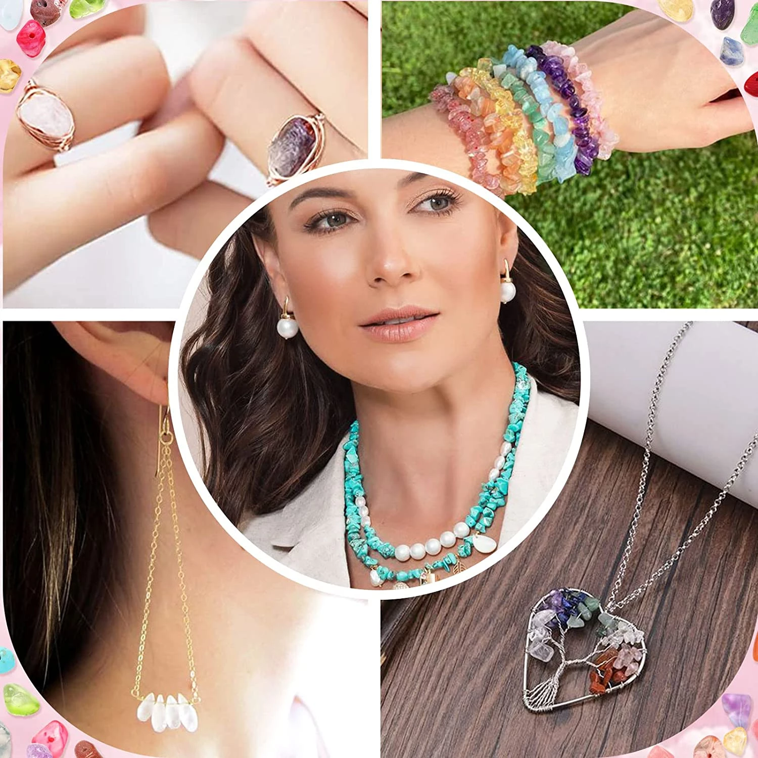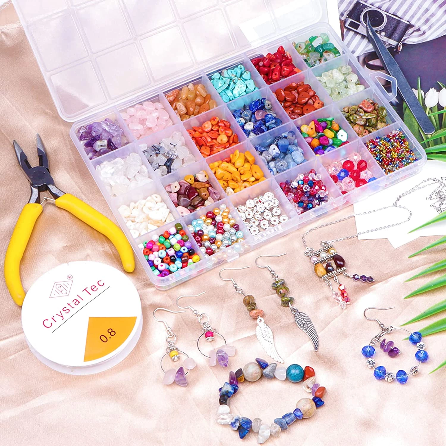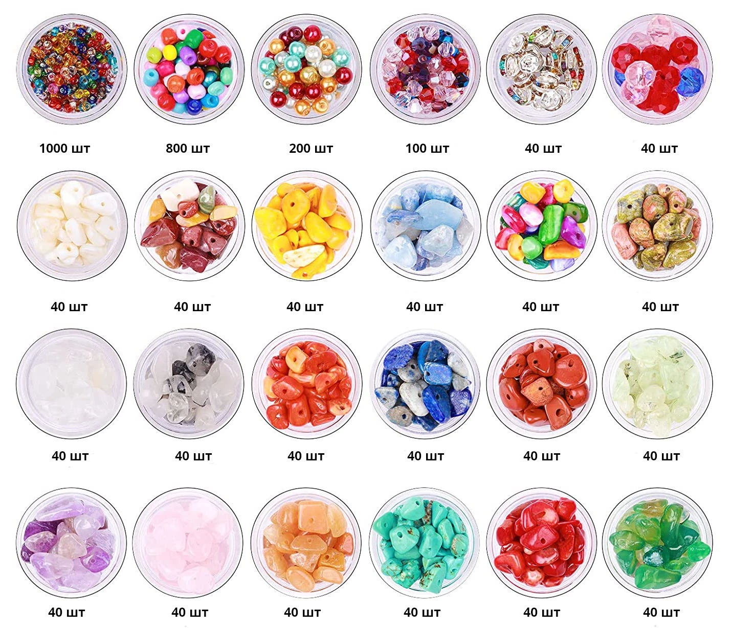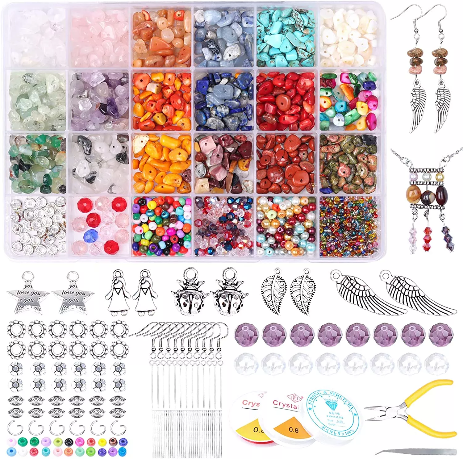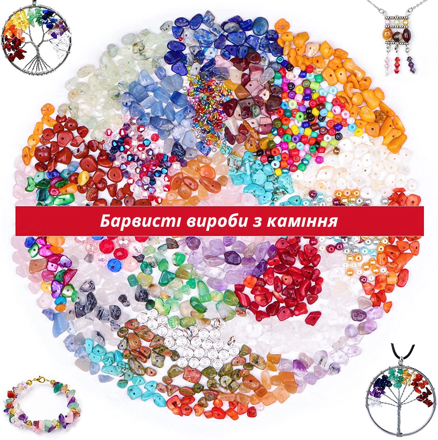 Цей набір кришталевих намистин включає 18 видів каменів неправильної форми, серед них аметист, рожевий кварц, червоний авантюрин, бірюза говлита, червоний корал, лазурит та інші. Крім каменів, набір укомплектований спеціальними інструментами для створення ювелірних прикрас. Намистини відмінно підходять для браслетів, намист, ножних браслетів, сережок, брошок, каблучок та інших виробів. Відмінний подарунок для рукодільниць віком від 6-ти років!