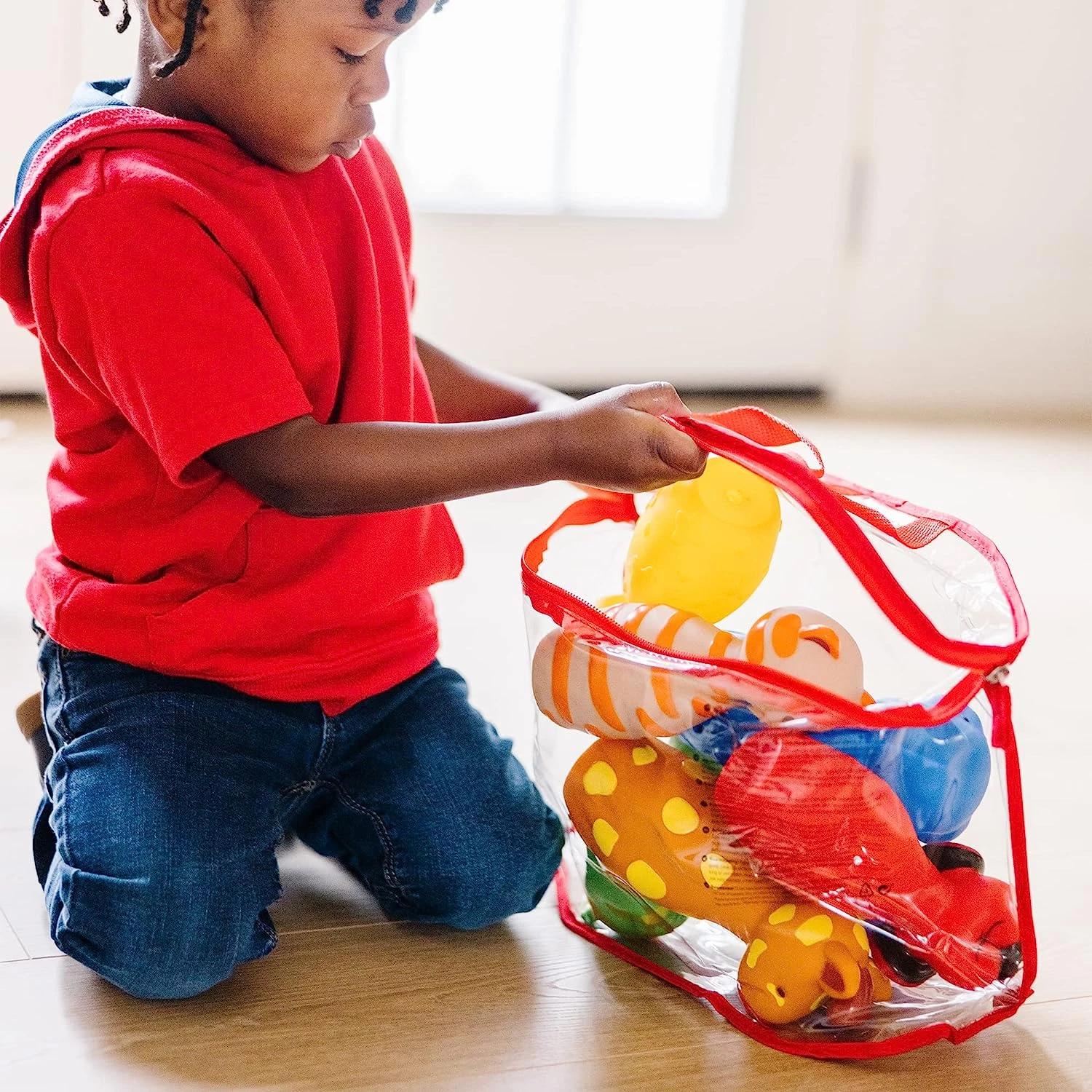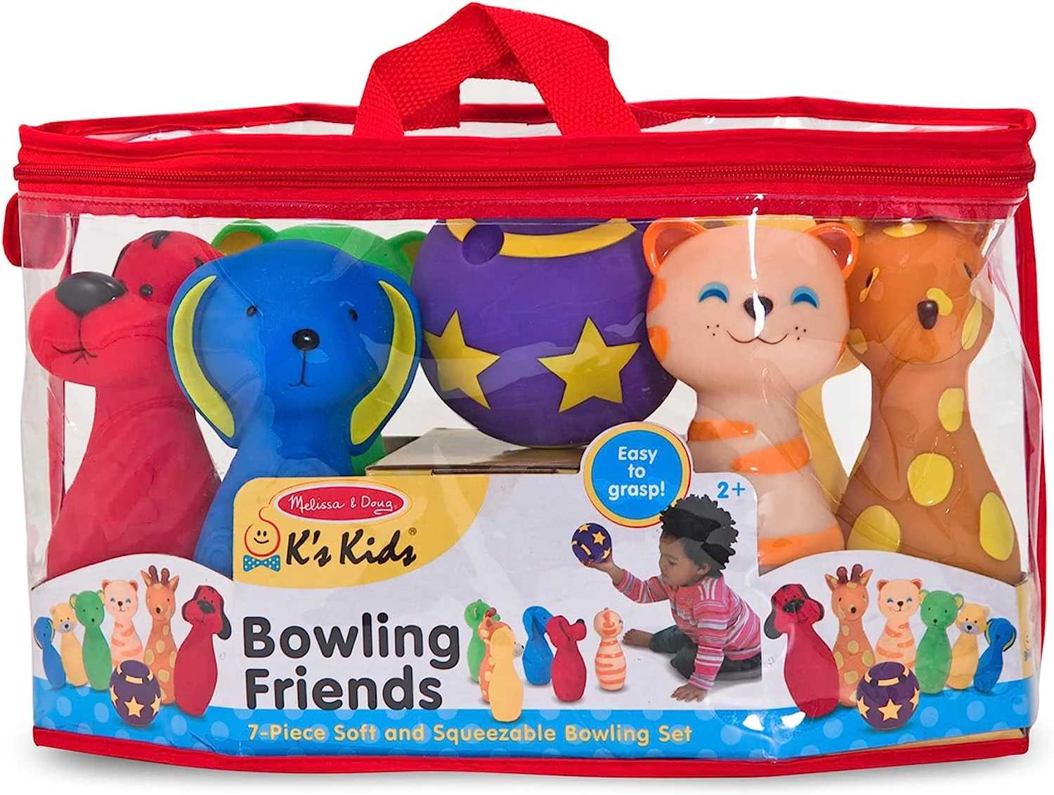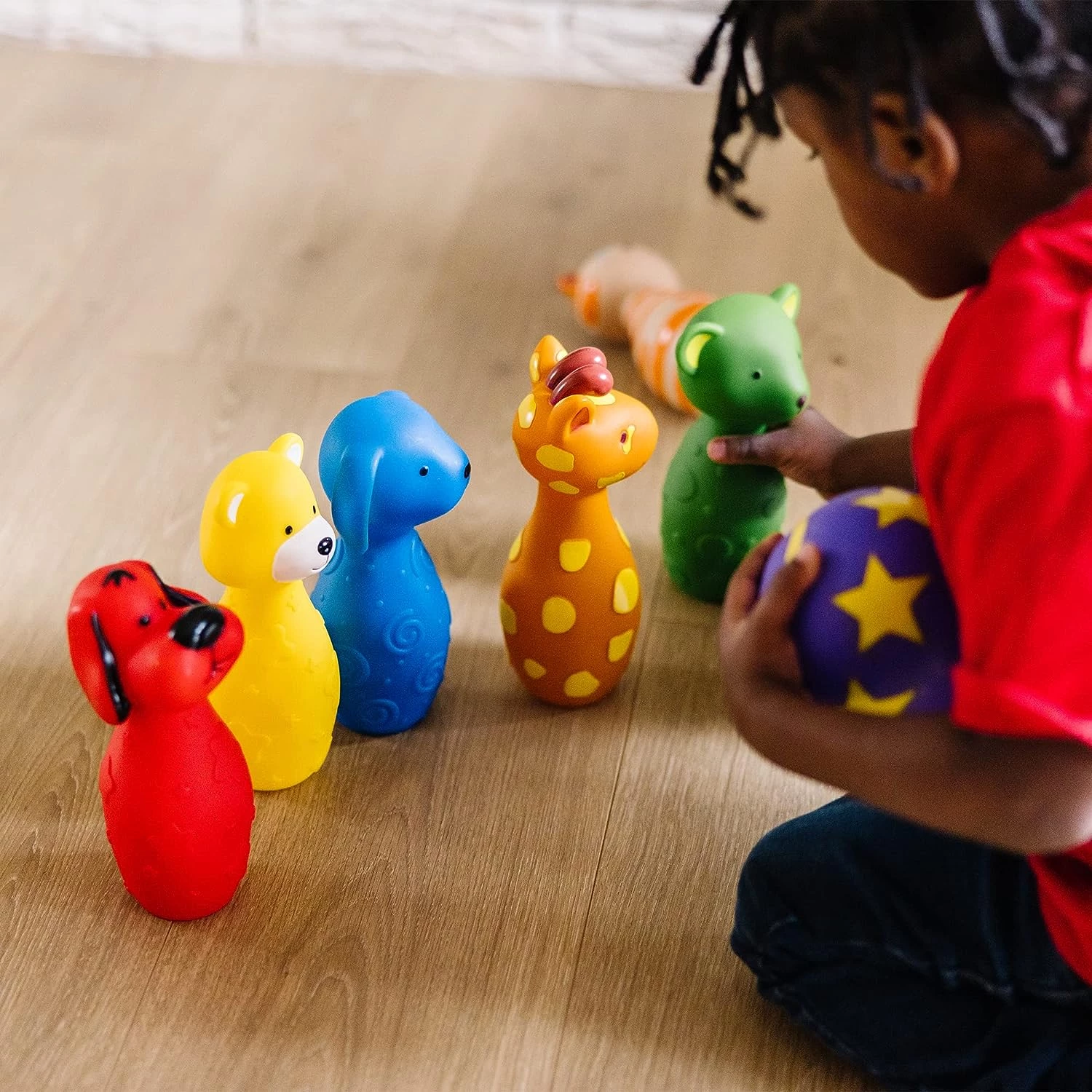 Цей плюшевий набір для боулінгу від відомої компанії Melissa & Doug включає 6 кеглів, виконаних у вигляді звірят, а також 10-сантиметрову кулю з виїмками і футляр на блискавці для зручного зберігання і перенесення ігрового комплекту. М'який набір для гри в боулінг легко встановлювати. Дно кожної кеглі обтяжене, що забезпечує хорошу стійкість, а отже, і комфортну гру.