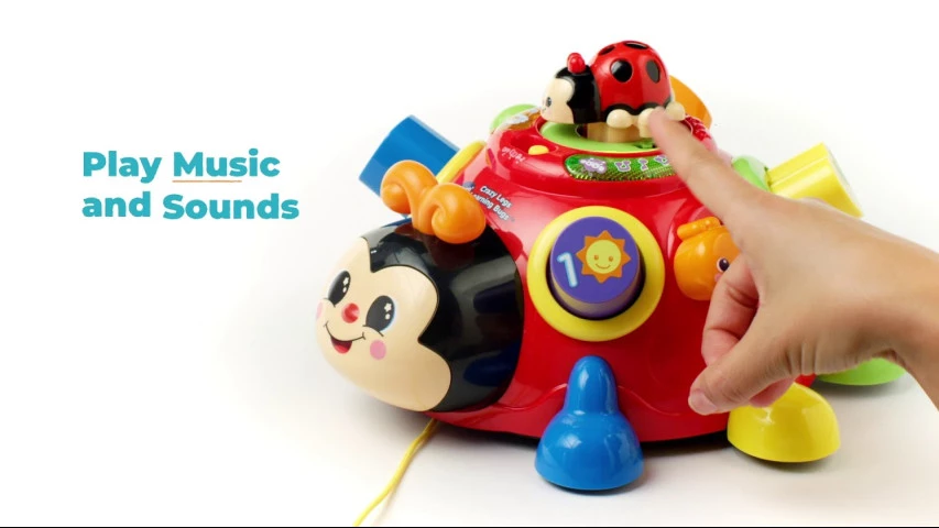 Забавне сонечко з друзями жучками навчить дітей формам, кольорам, числам. Двоє друзів жучка активують звуки і музику з блискучими кнопками на спині сонечка. Переверніть крило метелика, поверніть гусеницю і поверніть маленьке сонечко, щоб розвивати моторні навички. Сортуйте кольорові фігурні блоки, а потім витягніть їх, натиснувши на маленьке сонечко.
