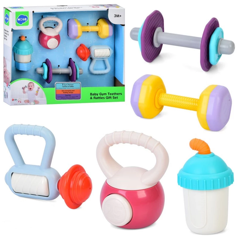 Цей розвивальний набір брязкалець — чудовий подарунок для маленьких спортсменів. У стильній коробці ви знайдете 5 яскравих брязкалець у вигляді гантелей, шейкера, ролика та гирі. Здивуйте вашого малюка стильними та яскравими брязкальцями.