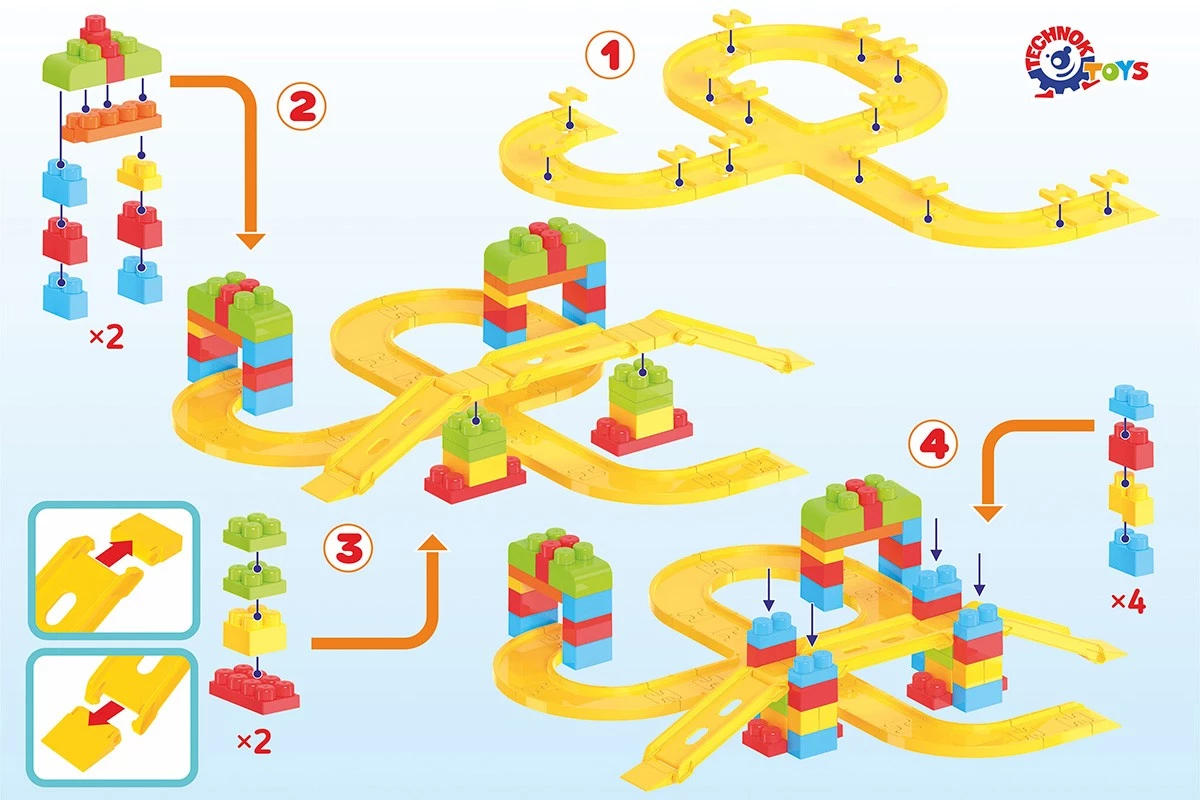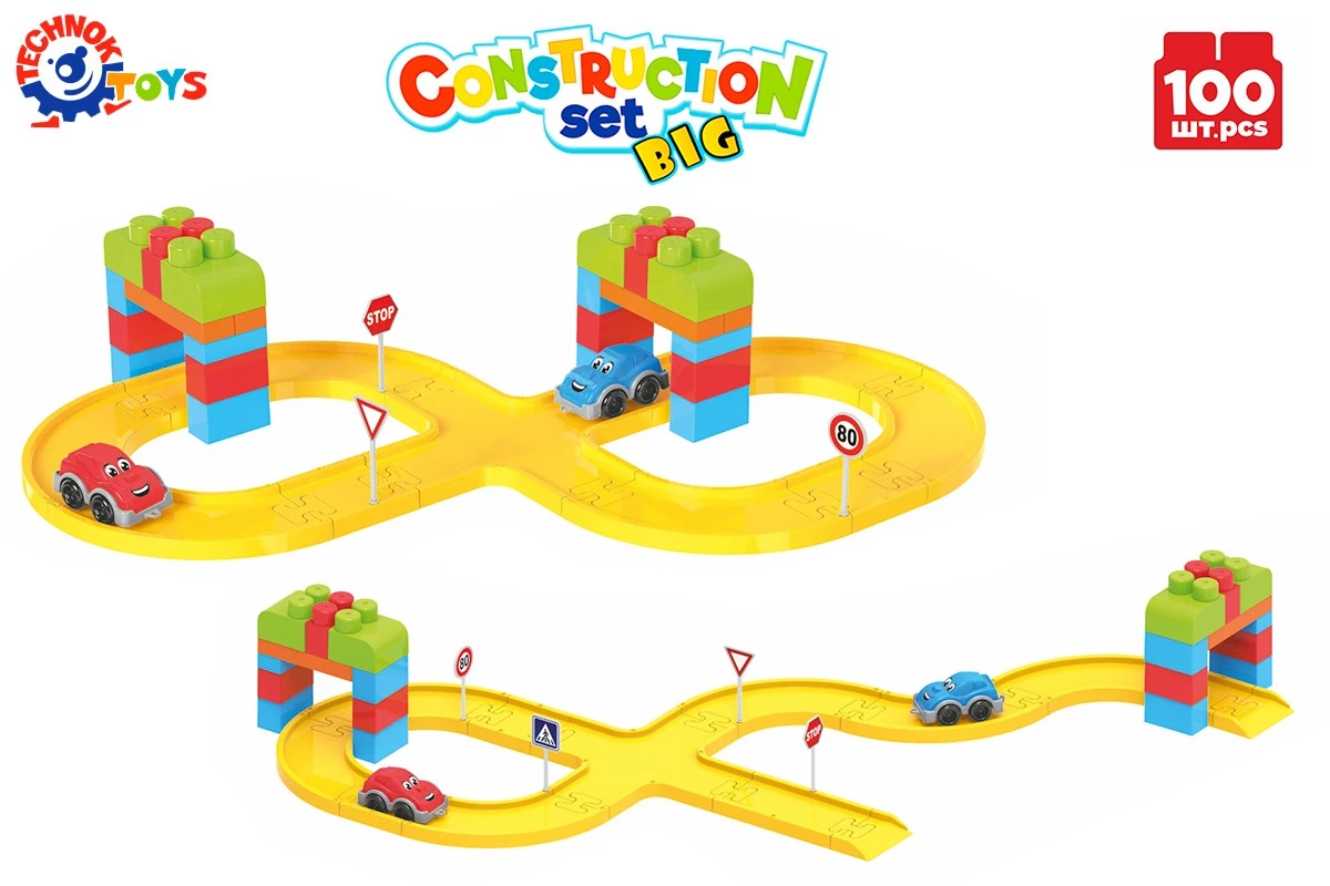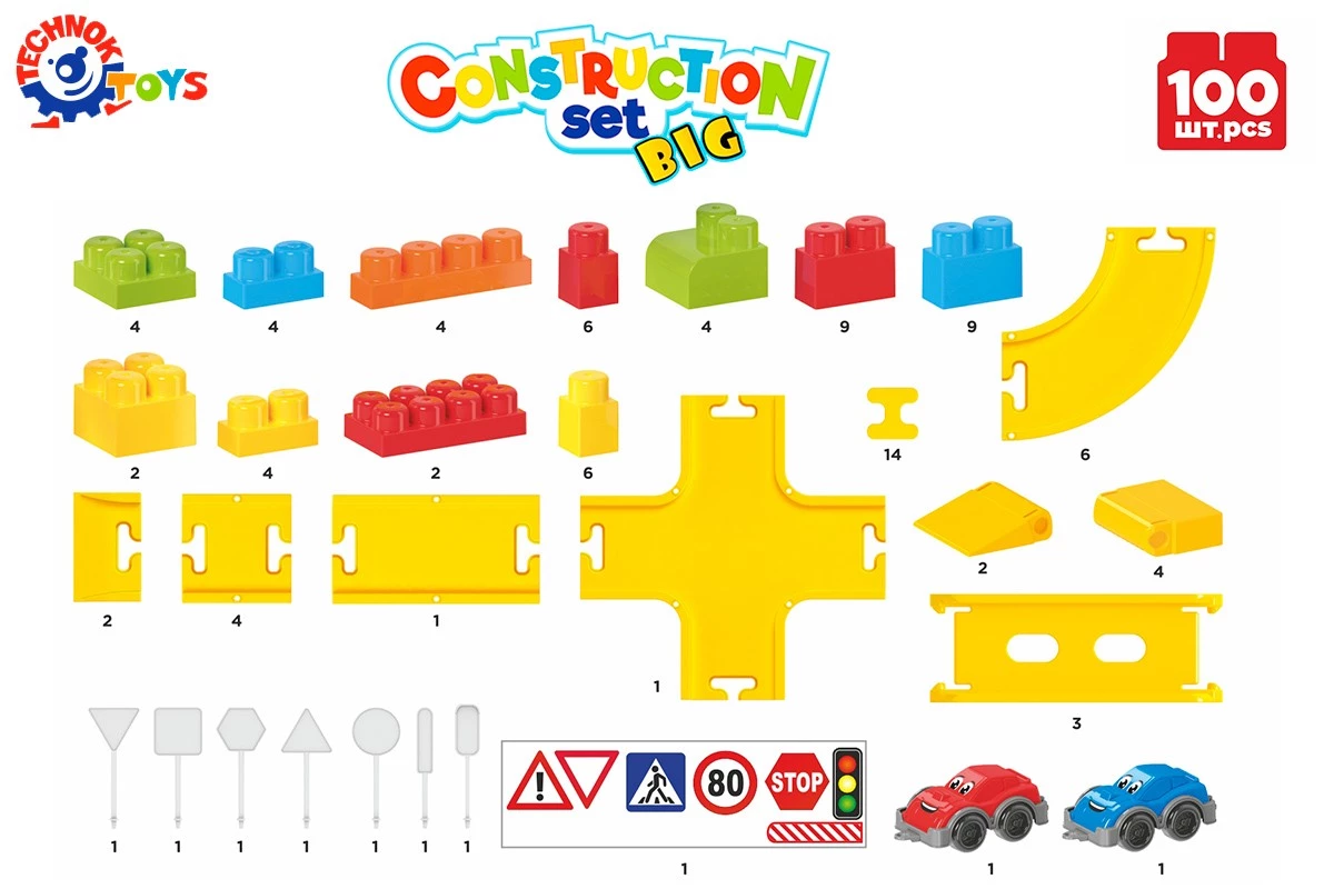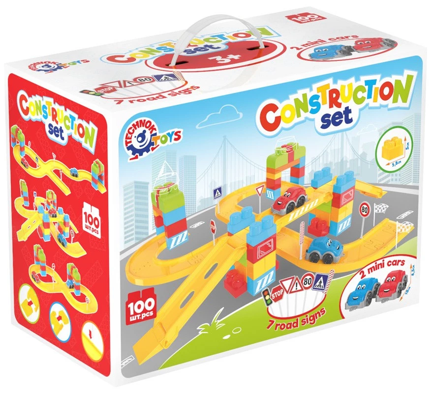 Будівельний набір, що включає 100 елементів, серед яких траси з перехрестями, поворотами, спусками, дорожніми знаками і машинками, стане відмінним подарунком для дітей віком від 3 років. Будівельні блоки мають ергономічні для маленьких дитячих ручок розміри. З блоків можна збудувати різноманітні будівлі: гаражі, паркінги, будиночки, кораблі або фігурки тварин.