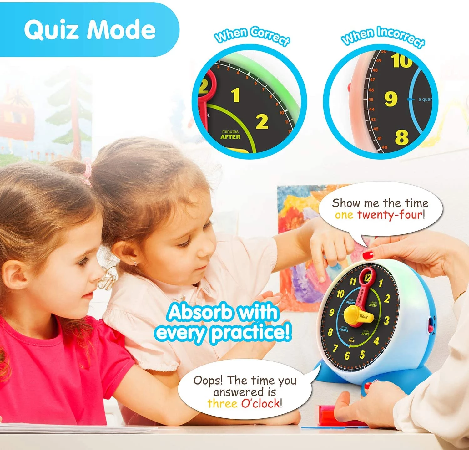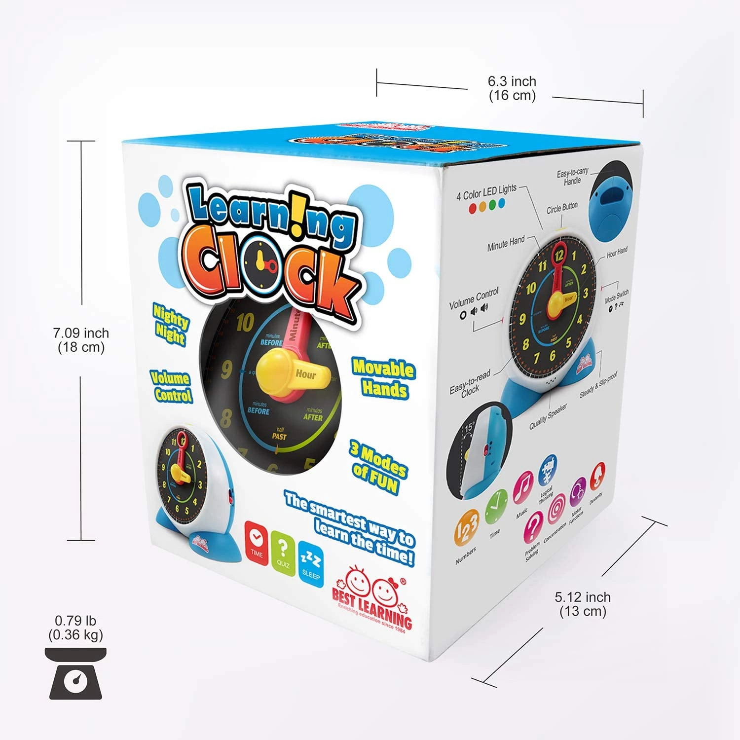 Розумна інтерактивна іграшка привертає увагу дітей, вчить розуміти годинник і хвилини, а ще це нічник з приємним світлом, якщо дитина боїться спати в темряві. Стрілки годинника і хвилин різного кольору, щоб дитині було легше розпізнавати час. Є режим вікторини, дитина практикує свої знання. У режимі вікторини, годинник просить дітей встановити певний час на годиннику з рухомою годинниковою стрілкою і хвилинною. Кольорове миготіння і звукові ефекти підкажуть - відповідь правильна чи ні. Якщо буде три неправильних відповіді - вікторина починається заново.
