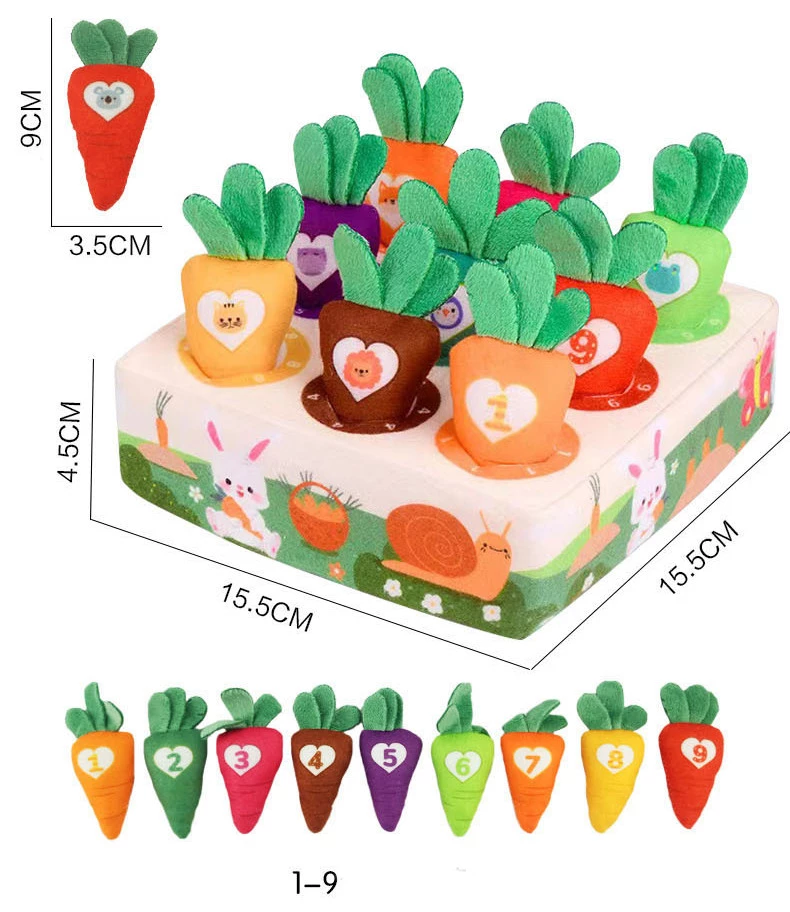 Цей набір для сортування та рахунку – справжня знахідка для маленьких городників! Він включає 9 різнокольорових морквин з цифрами і зображеннями звіряток. Відмінний вибір для ігор на сортування.