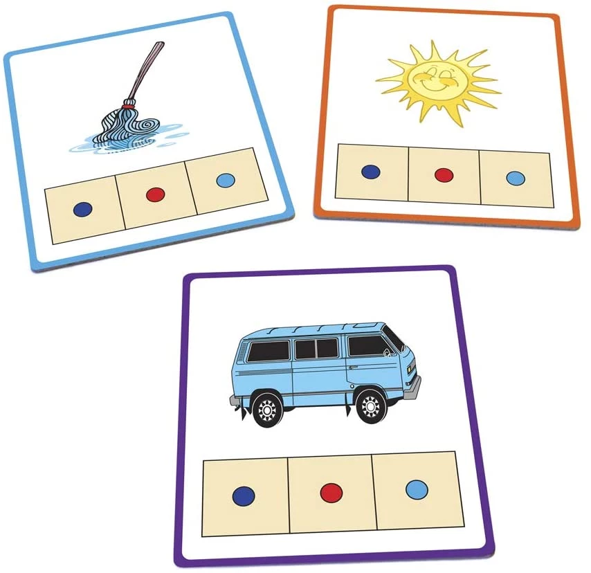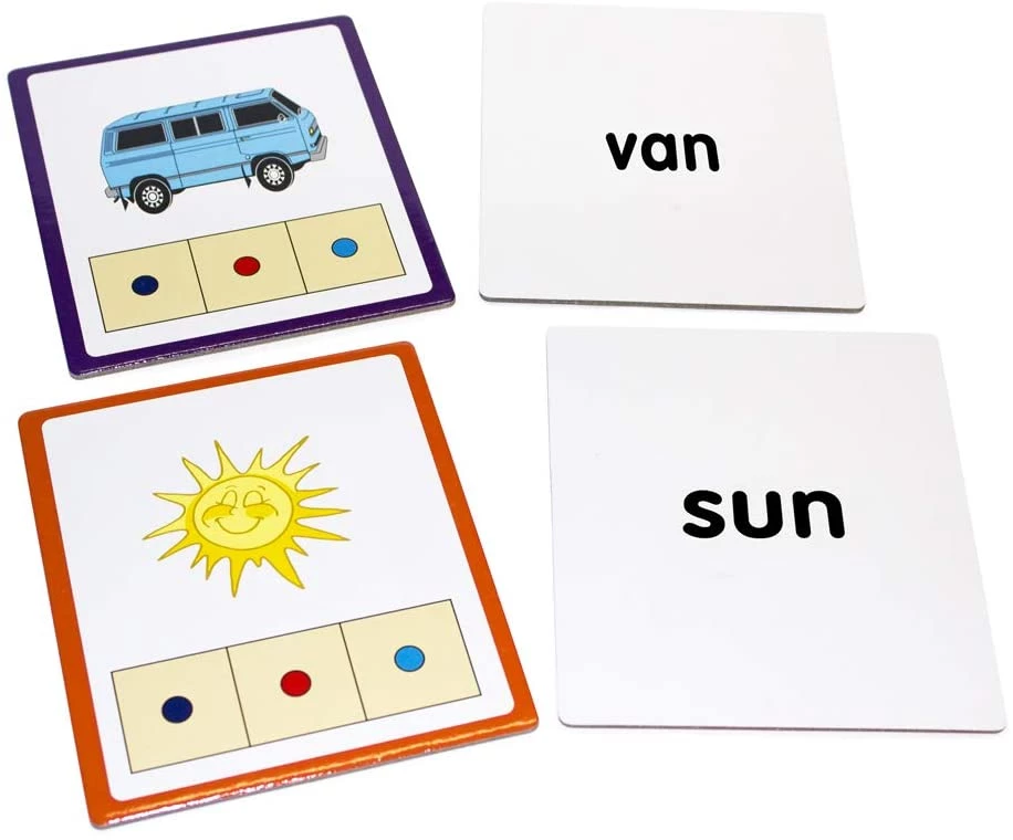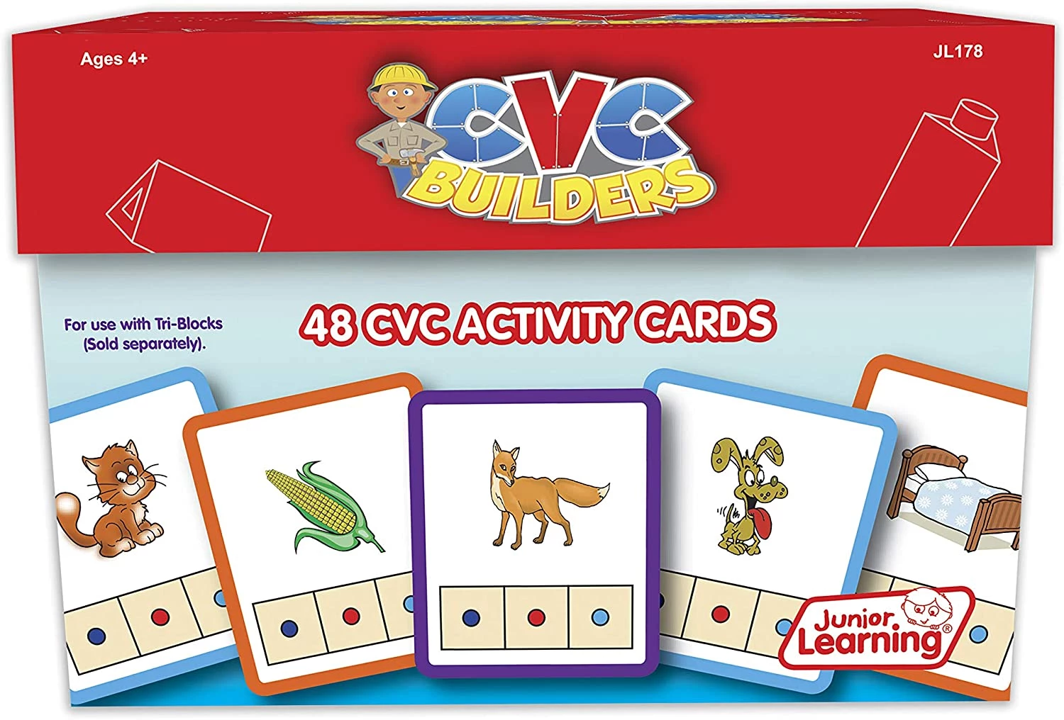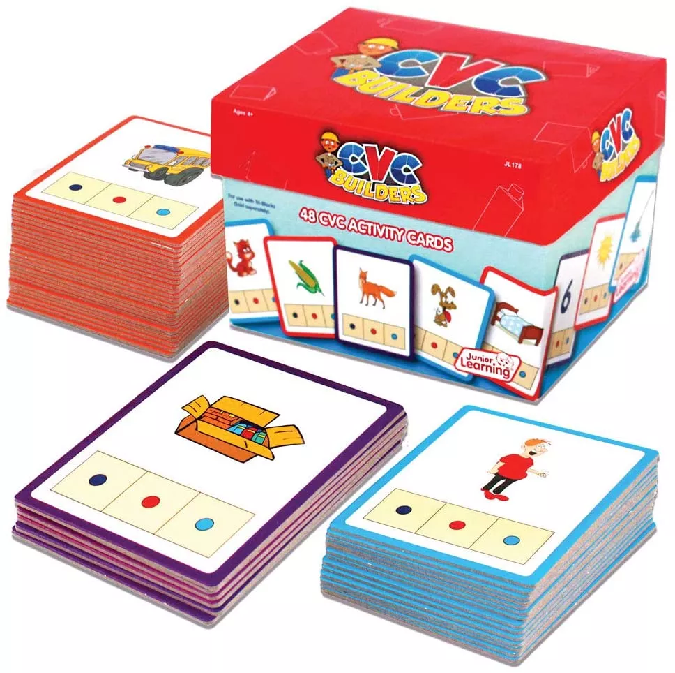 Картки з побудови слів CVC можна використовувати для озвучування або визначення звуків в трибуквених словах. Колірне кодування зображення і фонеми представлені на одній стороні, а слово цілком представлено на зворотному боці карток. Передбачено 3 рівні складності, і вони мають кольорове маркування по краях.