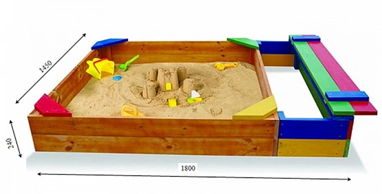 Прекрасний варіант пісочниці, в якому є зручний відсік для зберігання дитячих іграшок, а кришку прикриває відсік, і можна використовувати його як місце для сидіння. Дизайн цієї конструкції приверне своєю яскравістю. Зручні лавки розташовані в кутах пісочниці. Просторість даної конструкції дозволить помістити туди велику кількість піску, а якість порадує усіх батьків, так як ця пісочниця зроблена з натурального дерева.