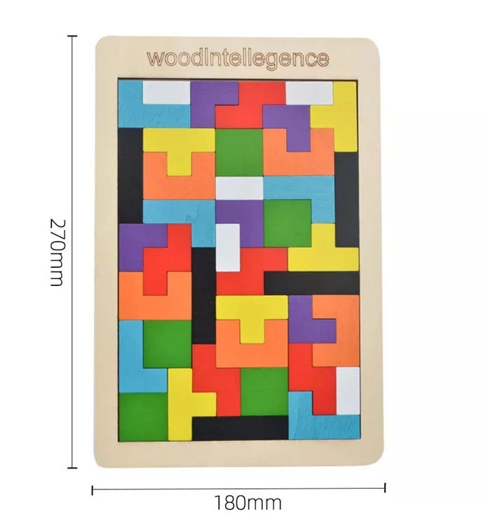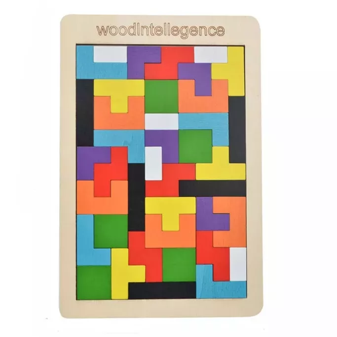 Чудова іграшка на розвиток логічного мислення та математичних навичок стане гарним подарунком для дітей віком від 3-х років. Представлена головоломка складається з рамки, яка має розмір 27 x 18 см, а також з різнокольорових дерев'яних фігур різних розмірів і форм, подібних до тих, які використовуються у знаменитій грі Тетрис. Завдання дитини — зібрати всі деталі усередині дерев'яної рамки, утворюючи різнокольоровий орнамент. Варіантів складання багато, тому іграшка не набридне дитині.