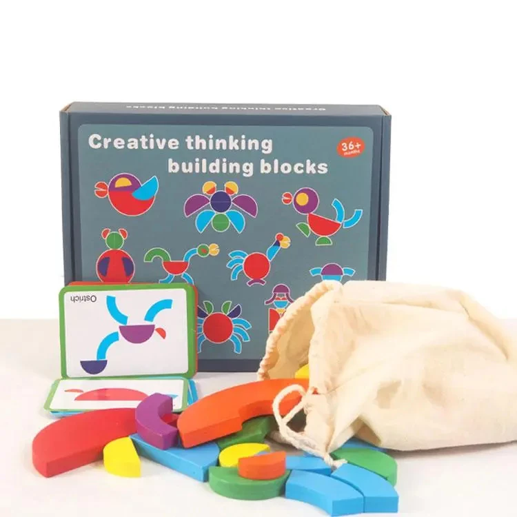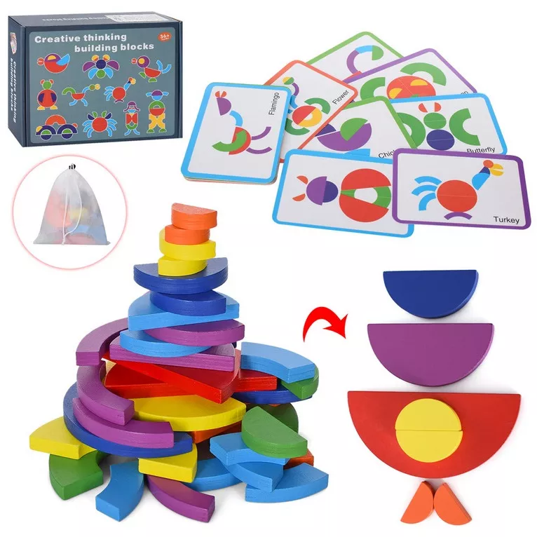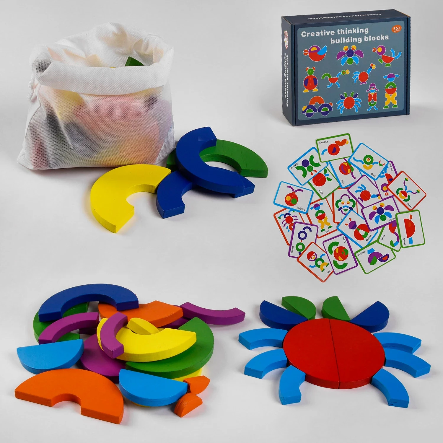 Представлений ігровий набір поєднав найбільш корисні для дитини розваги: пазл, головоломку, мозаїку і конструктор. Він містить 32 деталі, виконані з якісної, натуральної деревини, а також 20 двосторонніх карток зі зразками, які належить зібрати дитині. Оскільки всі елементи набору зроблені з дерева, дана іграшка є відмінним вибором для малюків і гідною заміною пластиковим наборам, так як пластик може містити шкідливі добавки.