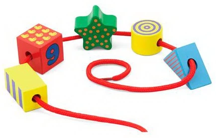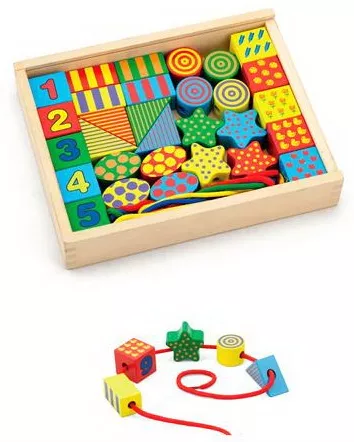 Комплект з дерев'яною шнурівкою може стати відмінним інструментом розвитку для дитини. Вивчаючи, нанизуючи, сортуючи і знімаючи різнокольорові елементи він добре розвине уважність, посидючість, дрібну моторику і логічне мислення. У наборі представлено 4 шнурка і 30 деталей різних форм і кольорів. Можна нанизувати за схемою, а можна хаотично. Є кубики з цифрами, малюк зможе попрактикуватися в рахунку. Гра зі шнурівкою добре зміцнить пальчики і підготує їх до листа.