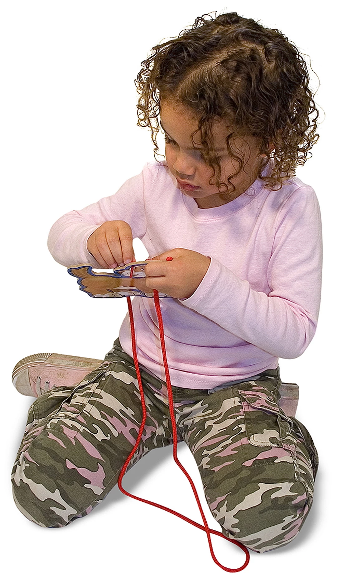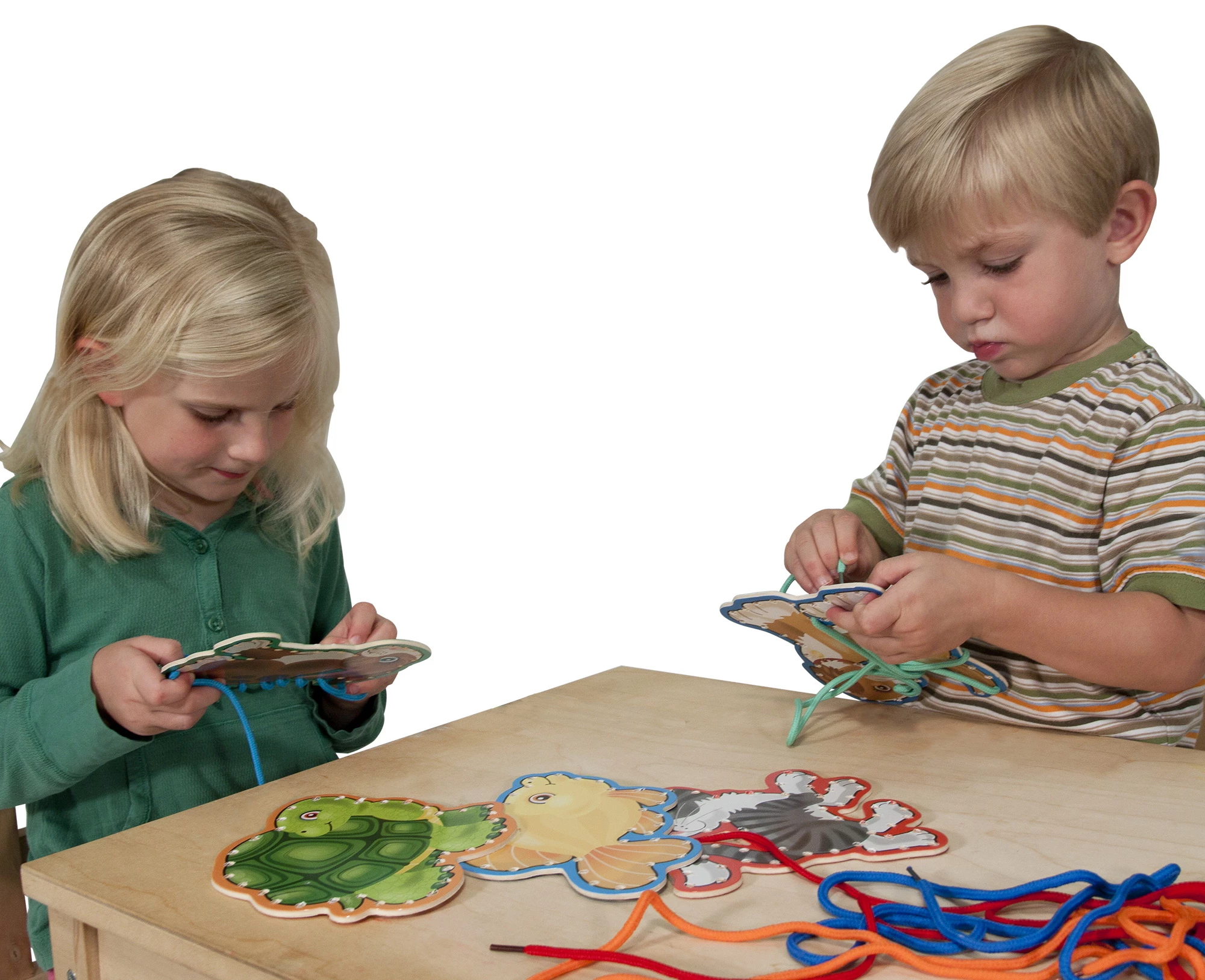 Цікавий розвиваючий набір призначений для тренування дрібної моторики і логічного мислення. У комплекті є п'ять рамок у вигляді тварин, кожна перфорована, в дірочки необхідно протягувати спеціальну мотузку. Набір виконаний з дерева, тому повністю безпечний і довговічний. Це чудовий подарунок на будь-яке свято, адже дитина зможе навчитися зав'язувати вузли, бантики, розвине координацію рук і очей.
