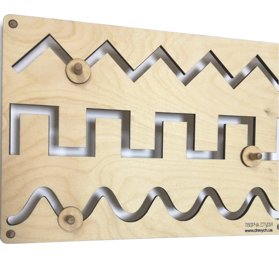Головоломка Монтессорі з бігунком, відмінно розвиває дрібну моторику, мислення, уяву, орієнтацію в просторі. На ігровому полі 3 види доріжок з бігунком.