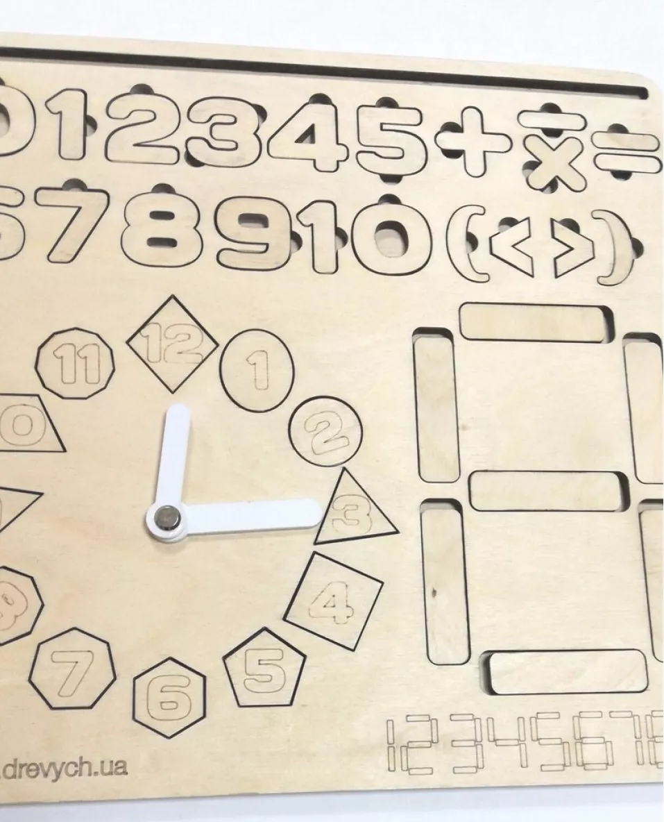 На бізіборді є поле з цифрами, поле для вивчення електронних цифр, і годинник з рухомими стрілками і геометричними фігурами.