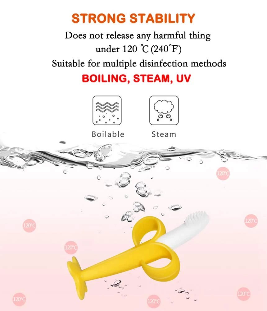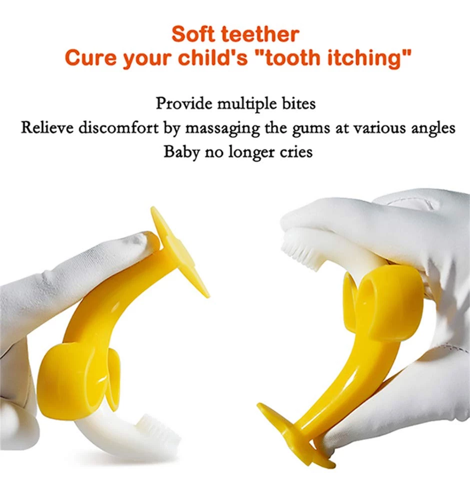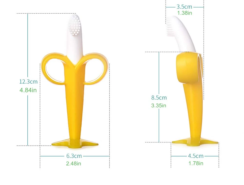 Така щітка для прорізування зубів допомагає дитині рости здоровою і щасливою, допомагаючи заспокоїти запалені ясна і сприяючи гігієну порожнини рота. Допомагає полегшити дискомфорт при прорізуванні зубів, а також запобігає утворенню карієсу. Це ідеальний варіант для першої зубної щітки! Кумедний зовнішній вигляд зробить процес більш веселим, а висока якість допоможе уникнути травм. Рекомендується дітям 3-12 місяців для полегшення болю під час прорізування зубів. Зубна щітка бананчик на 100% складається з харчового силікону, який не травмує ясна, не має запаху і не викликає алергію. Матеріал не містить бісфенол А.