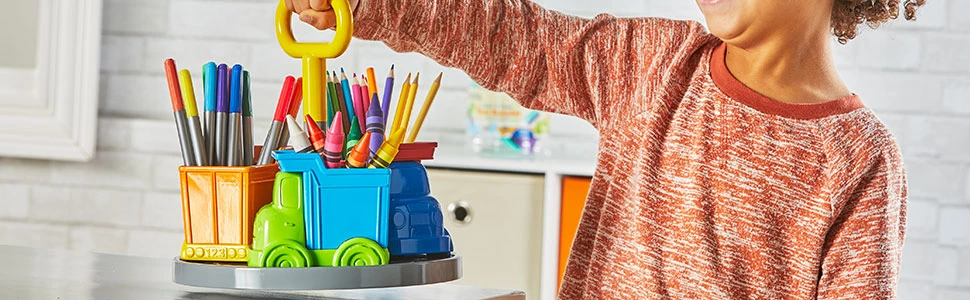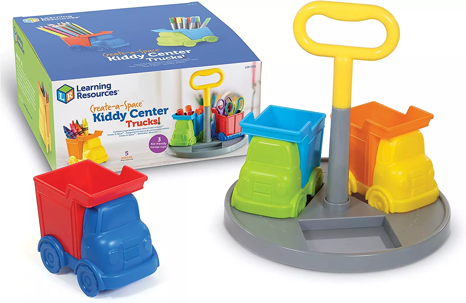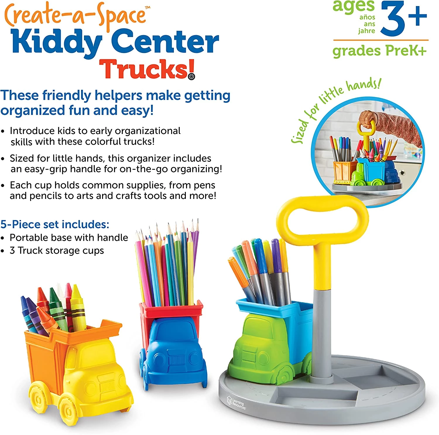 Цей виріб, що належить до популярної серії органайзерів Create-a-Space, складається з 3 контейнерів для зберігання канцтоварів, виконаних у вигляді різнокольорових вантажівок. Їхній розмір ідеально підходить для маленьких рук малюка.