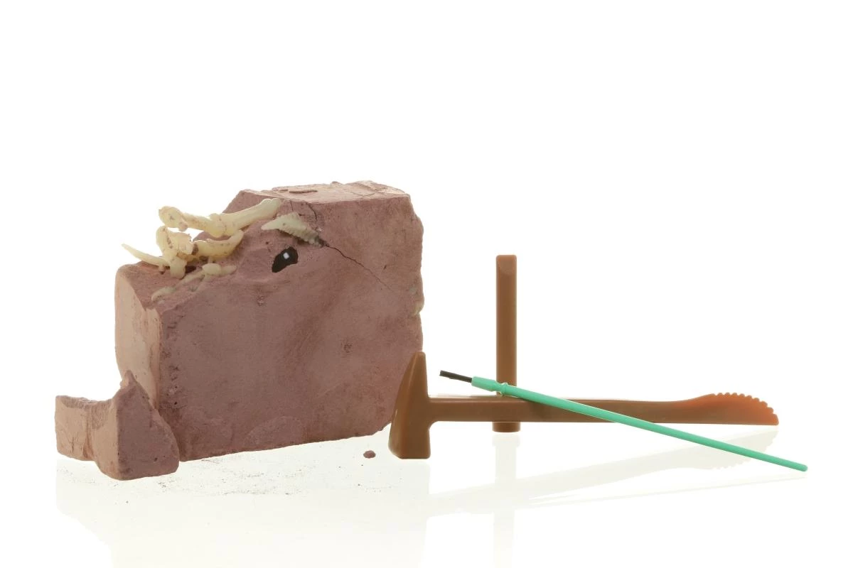 У гіпсовому блоці 12 частин скелета динозавра: щелепа, череп, хребет, хвіст, грудна клітка, дві кістки таза, нижні і верхні парні кінцівки. В знайдених останках потрібно акуратно видалити пил всередині прорізів скелета за допомогою пензлика.