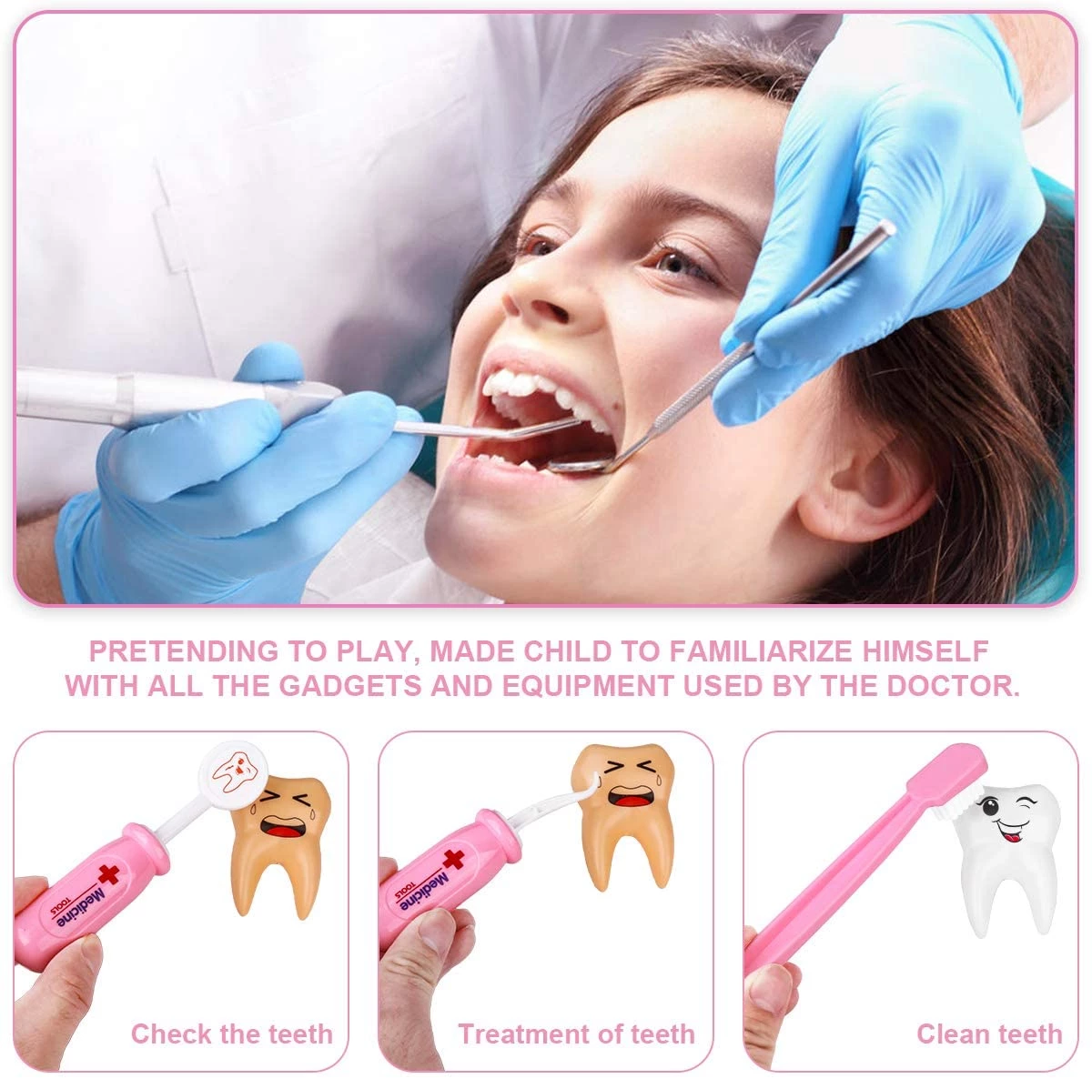 Прекрасний набір, в якому є все, для цікавої гри в зубного лікаря. Одягнувши халат лікаря, дитина відчує себе справжнім зубним лікарем. Велика кількість різних предметів легко зробить гру різноманітною і цікавою. Плюс такої ігри добре розвиває у багатьох напрямках, в тому числі позитивно діють на моторику рук, логіку і кмітливість.