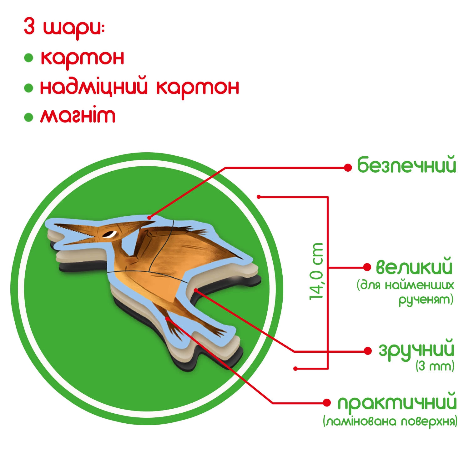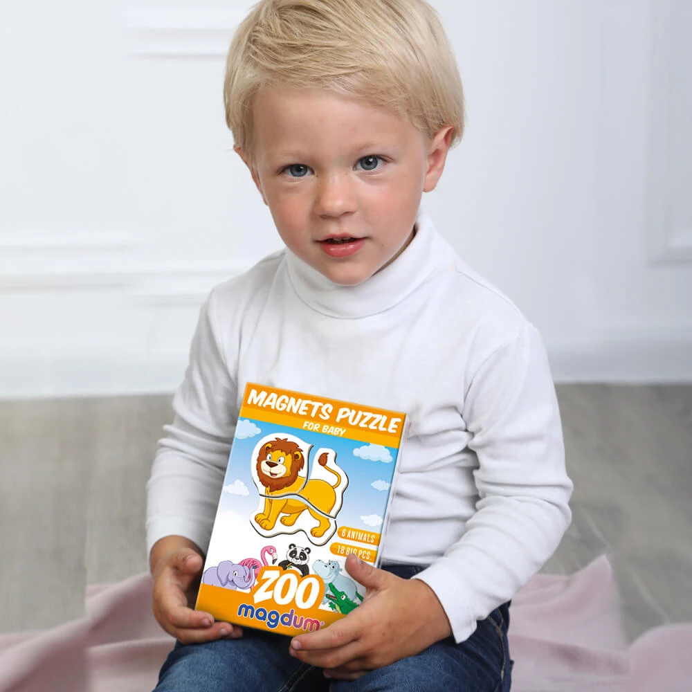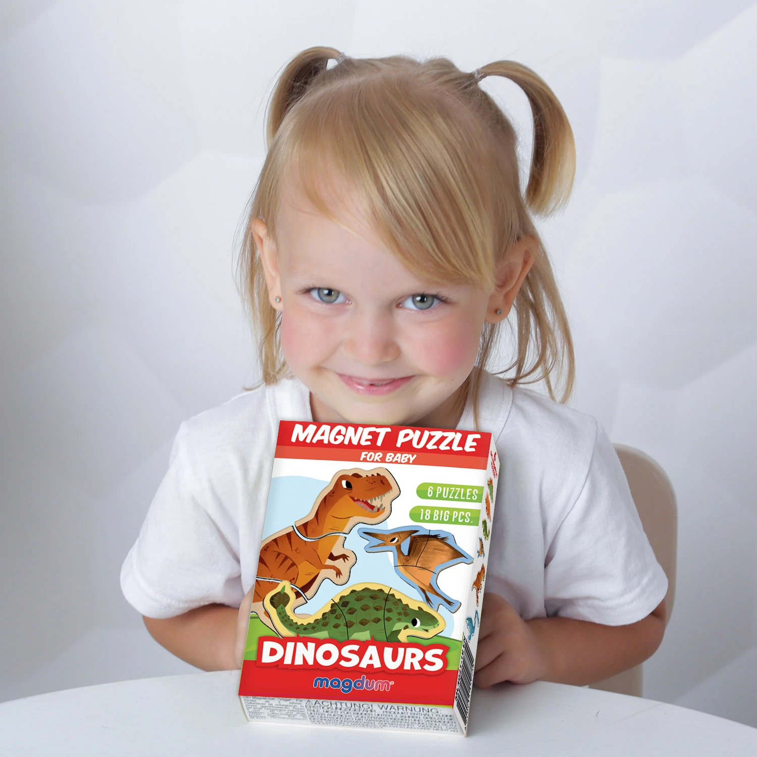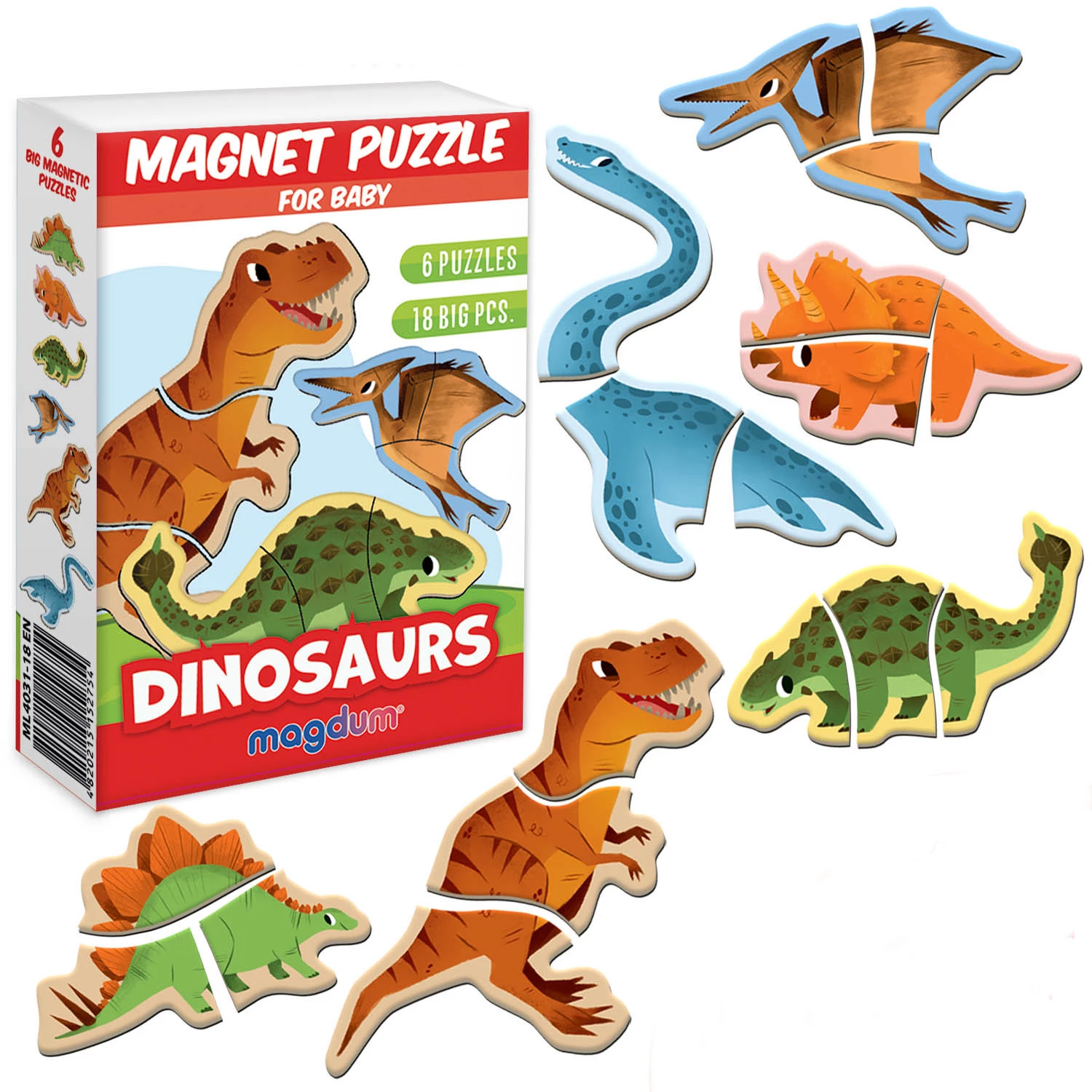 Набір магнітних пазлів включає 18 великих деталей, з яких дитина збере 6 яскравих звірят. Можна вибрати з кількох тем: домашні тварини, динозаври, тварини зоопарку або морські жителі.