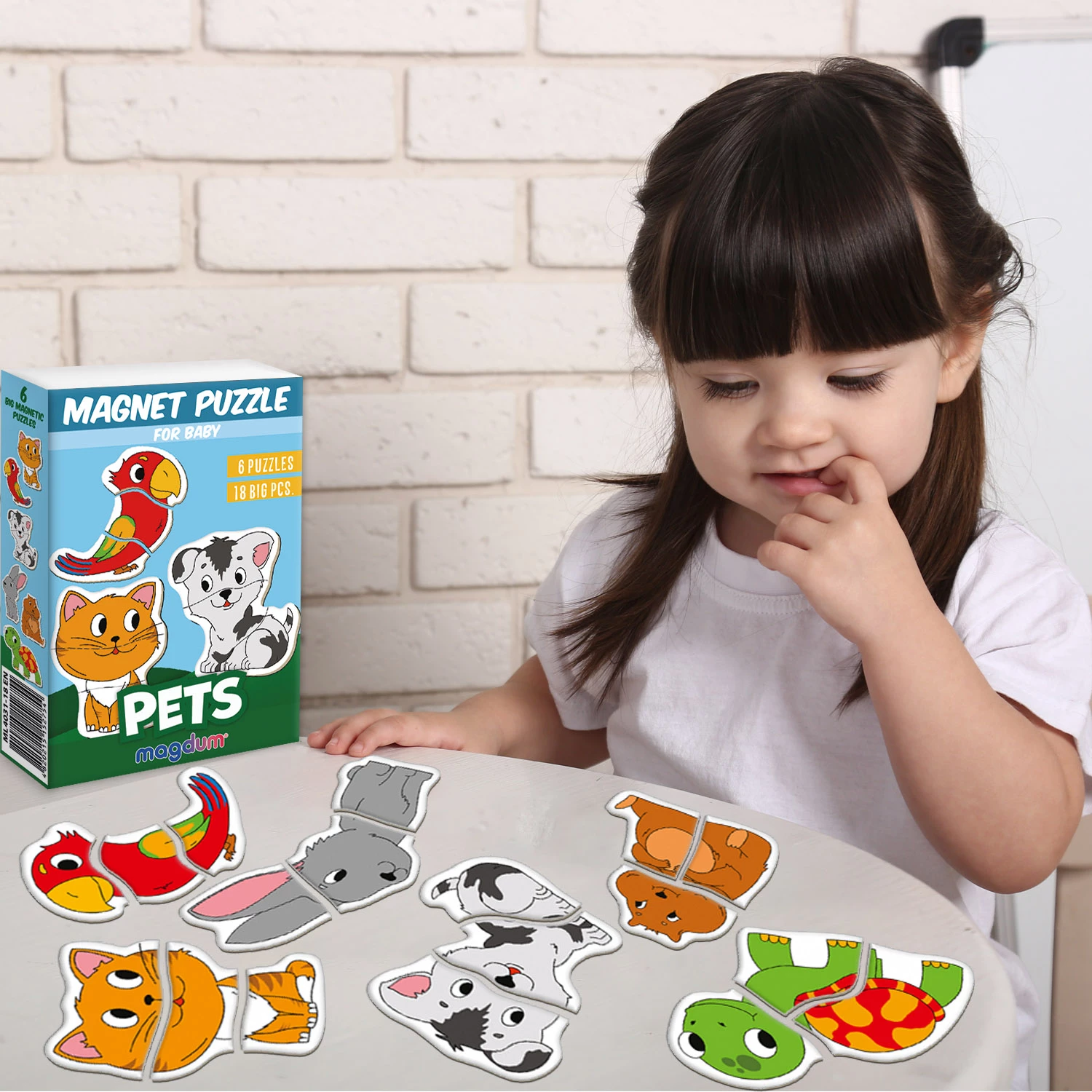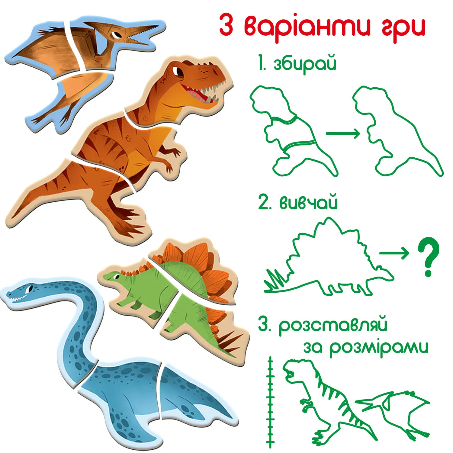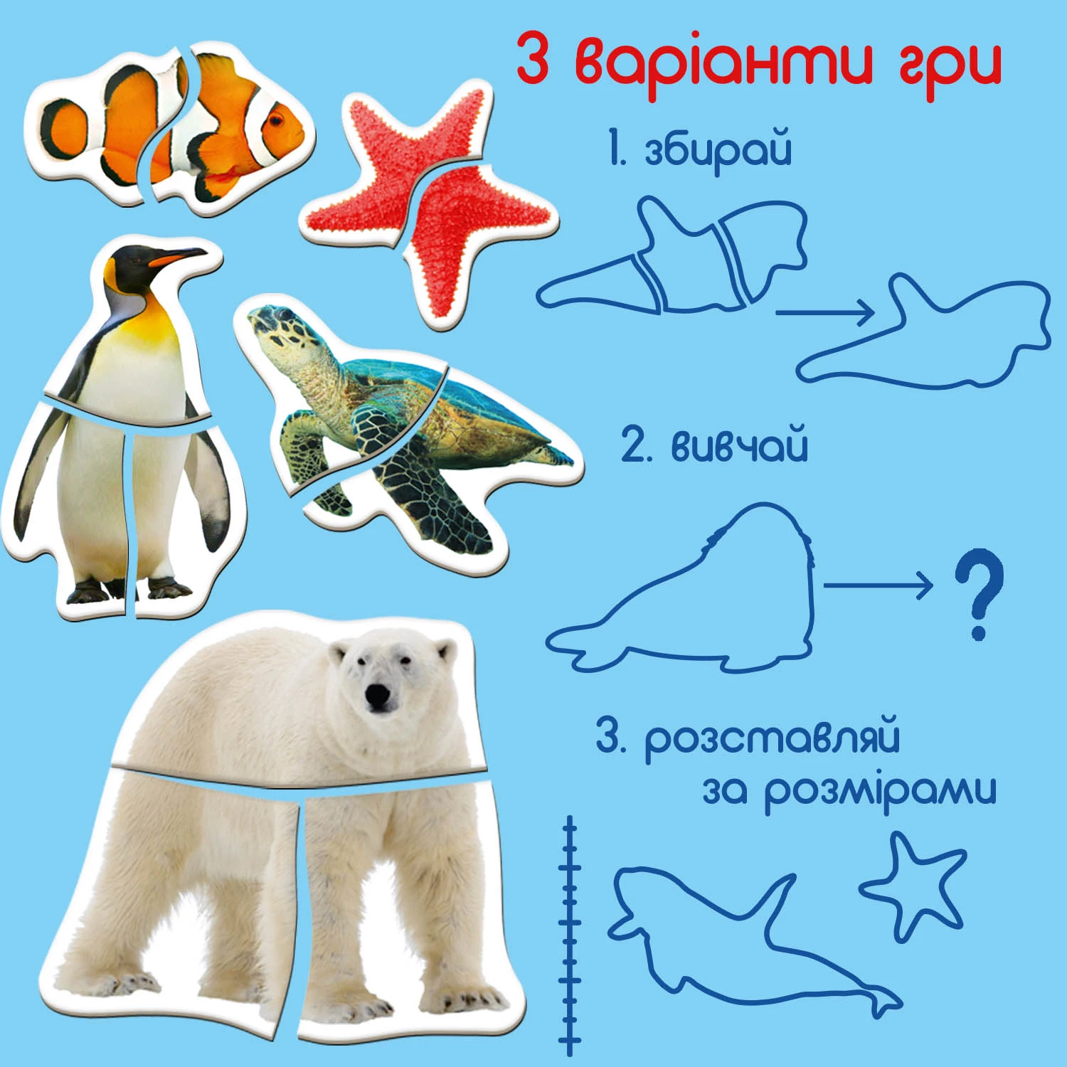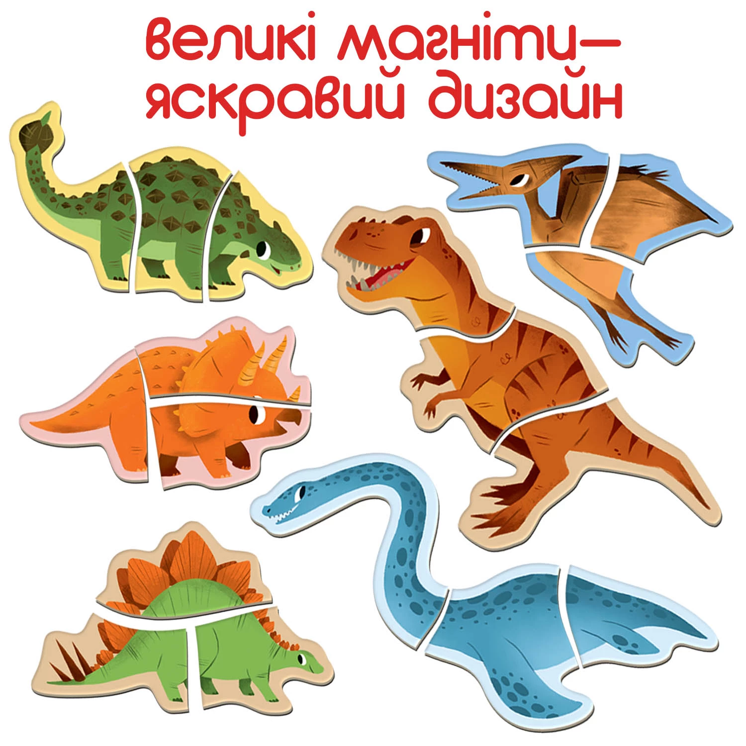 Набір магнітних пазлів включає 18 великих деталей, з яких дитина збере 6 яскравих звірят. Можна вибрати з кількох тем: домашні тварини, динозаври, тварини зоопарку або морські жителі.