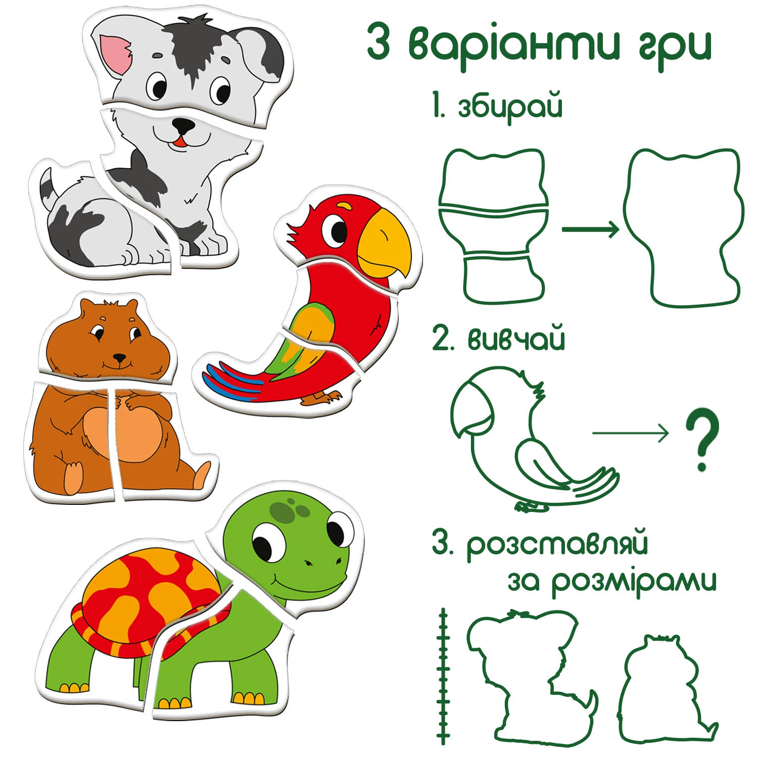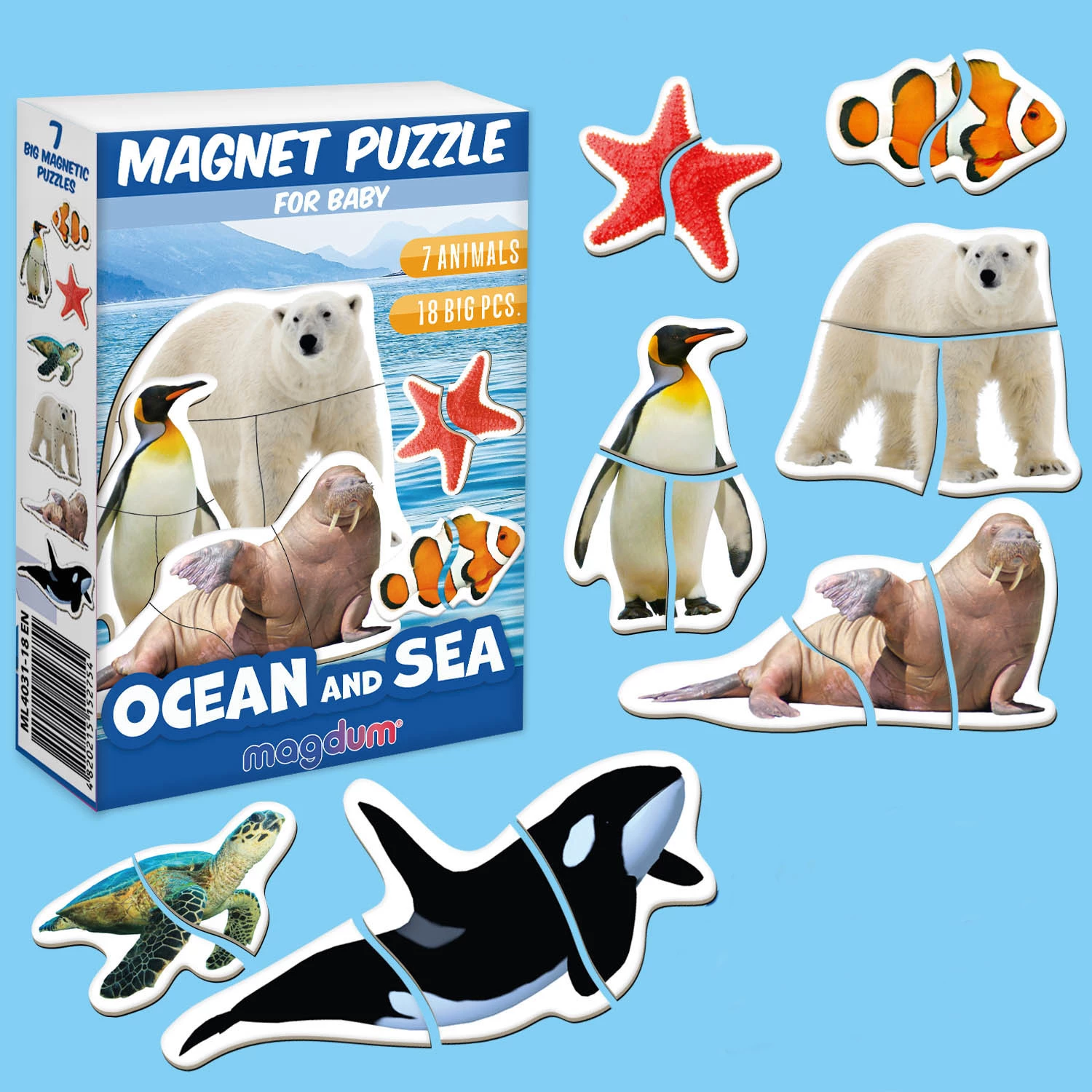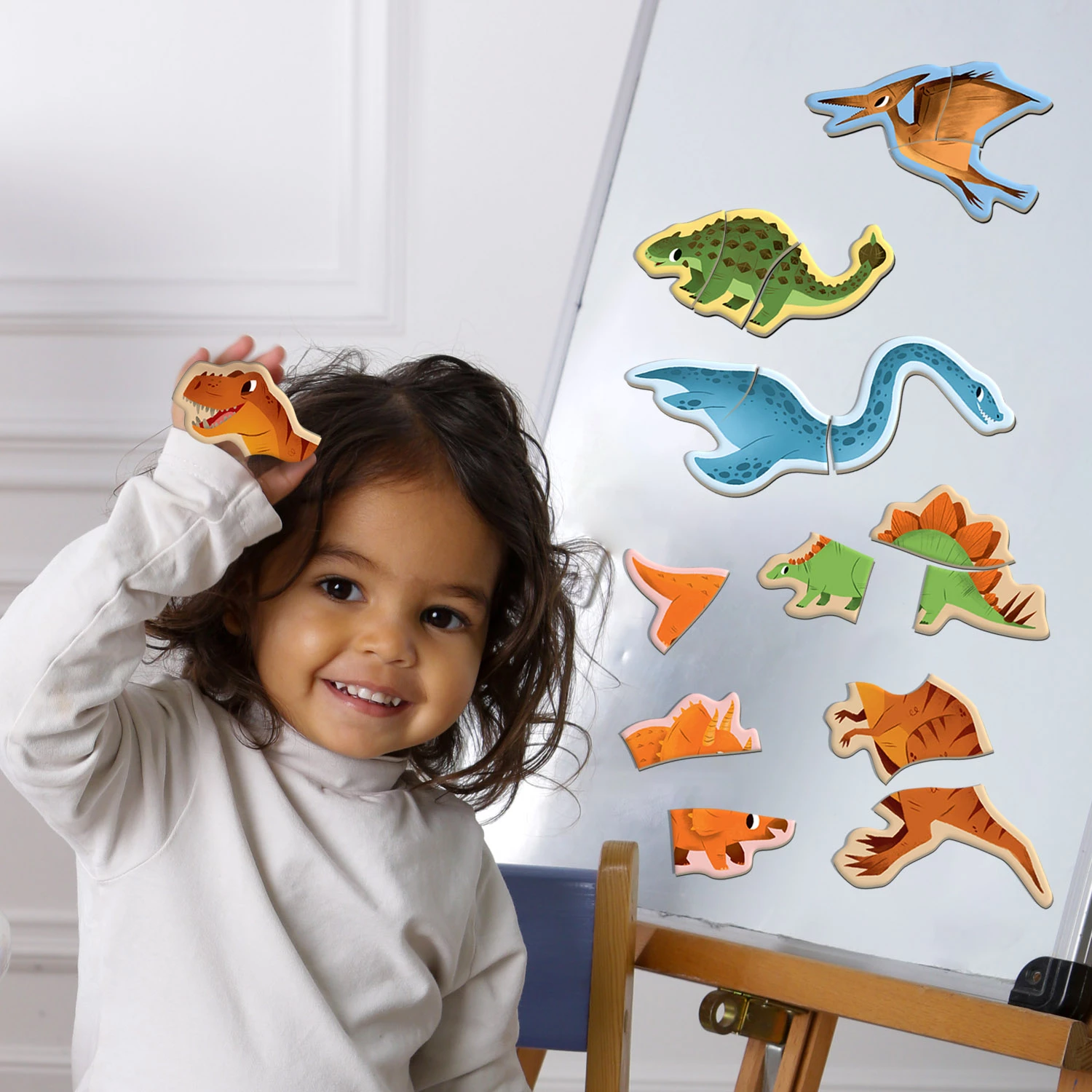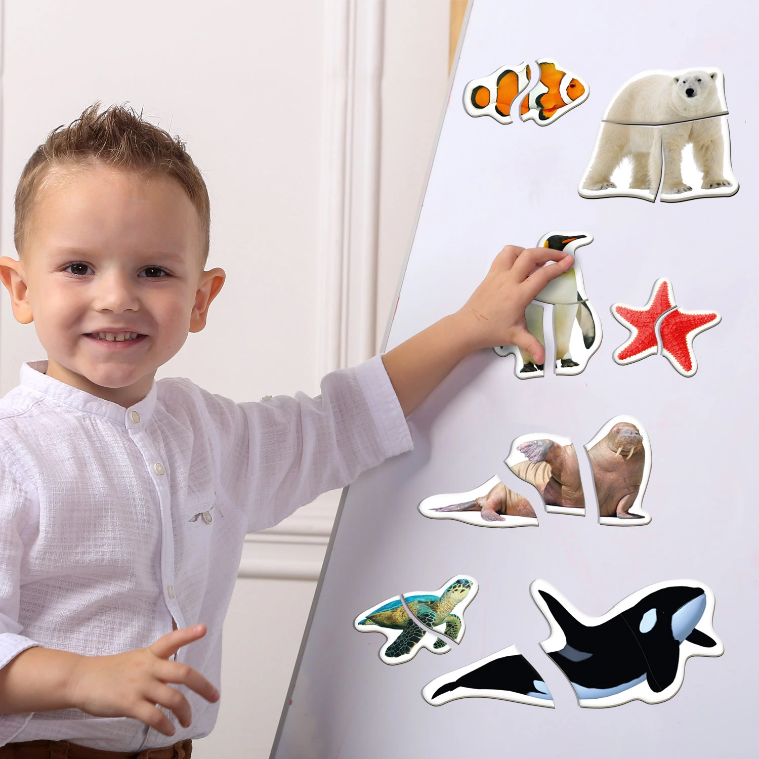 Набір магнітних пазлів включає 18 великих деталей, з яких дитина збере 6 яскравих звірят. Можна вибрати з кількох тем: домашні тварини, динозаври, тварини зоопарку або морські жителі.