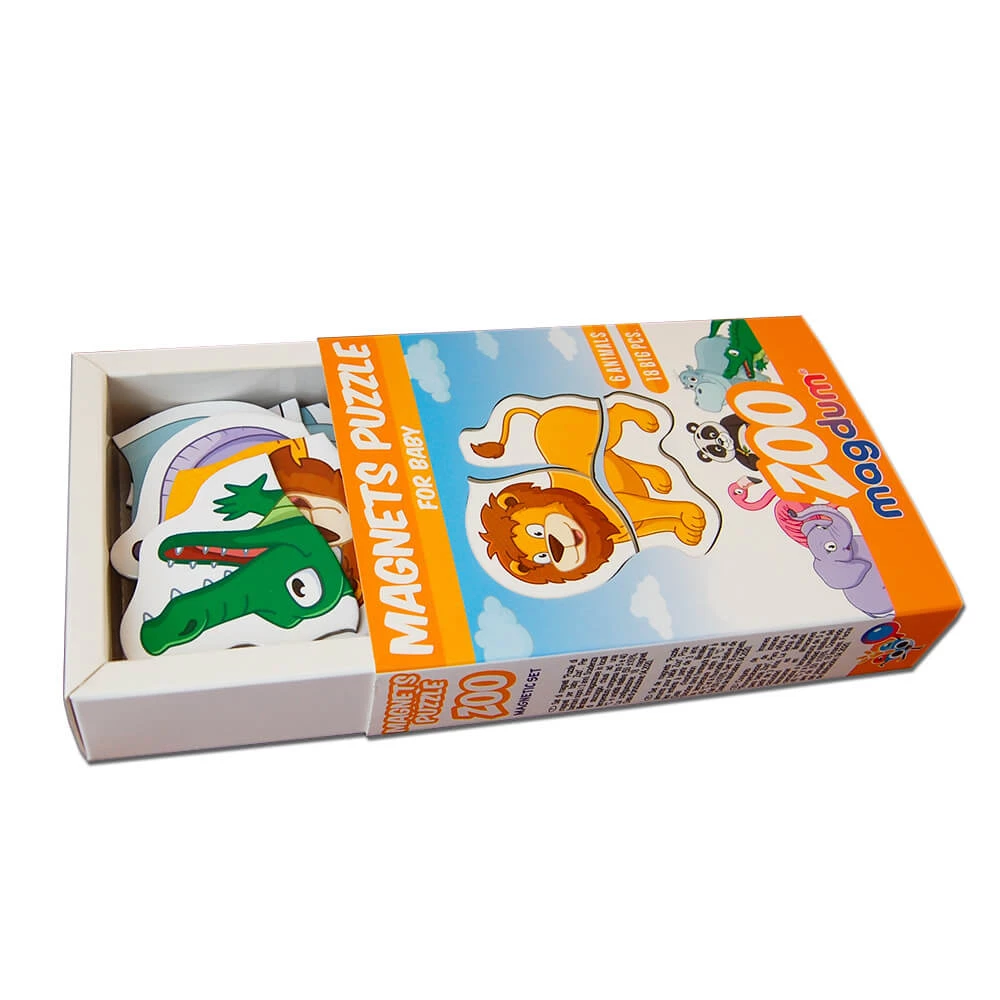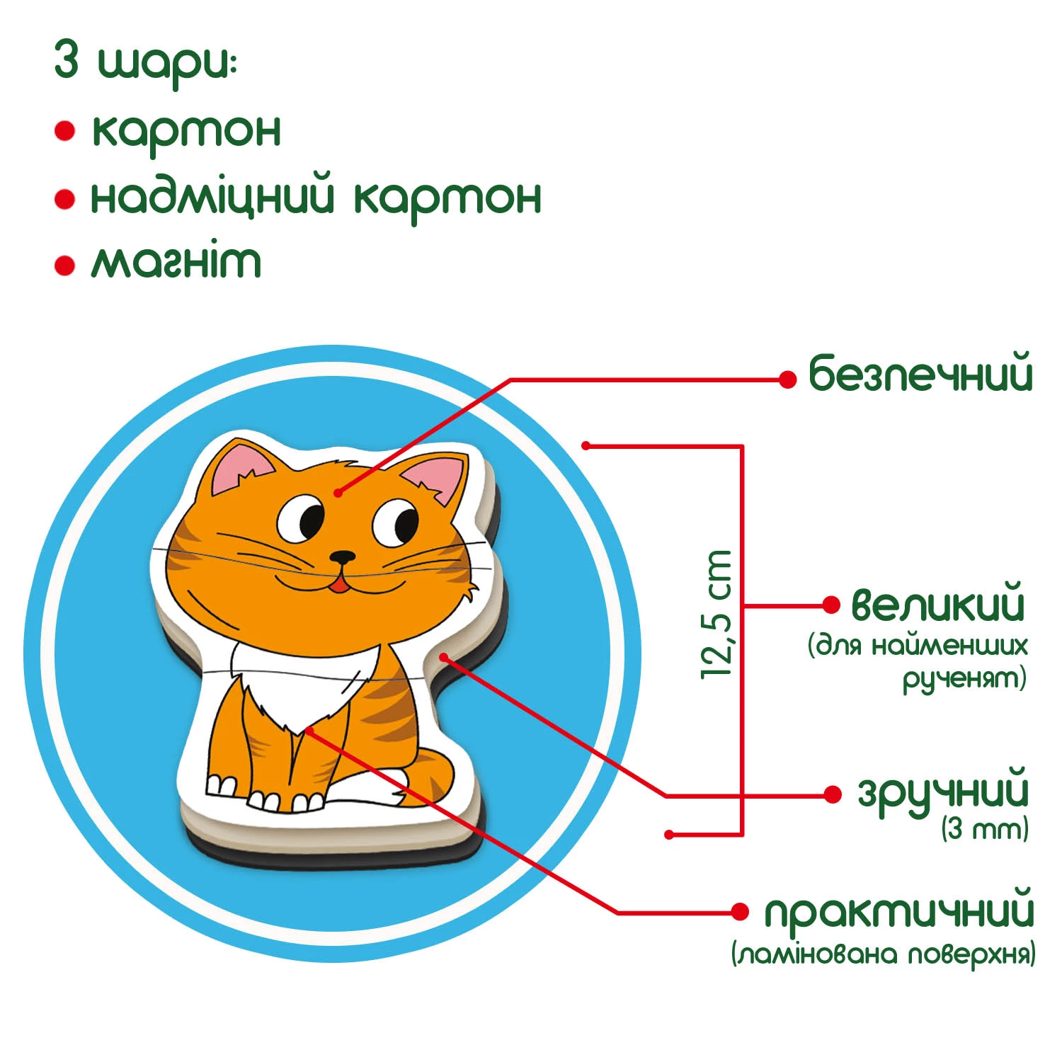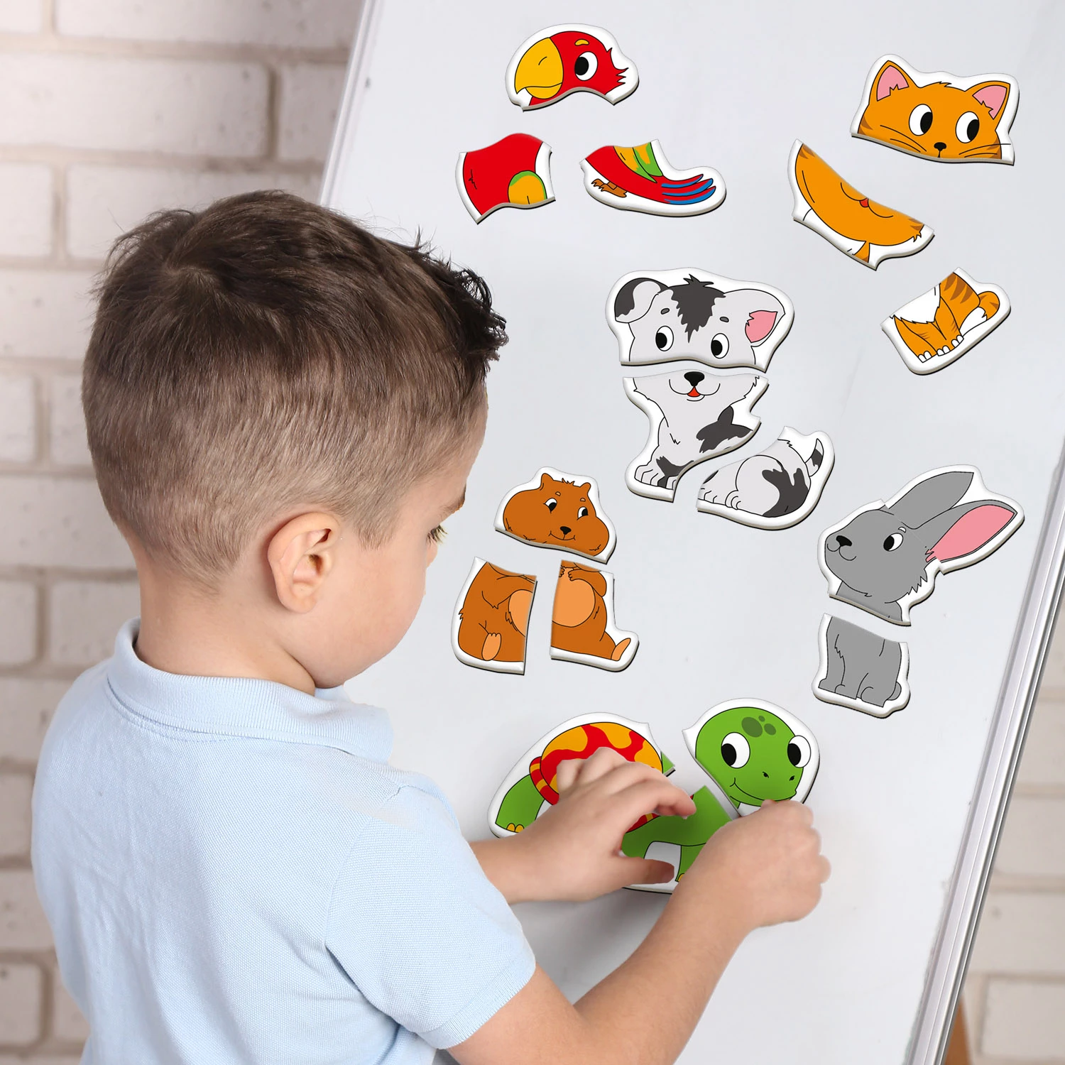 Щоб зібрати тварину, необхідно з'єднати 3 деталі. Магніти зручні для дитячих ручок, вони міцні та якісні. Грати можна на магнітній дошці, холодильнику та інших рівних металевих поверхнях.
