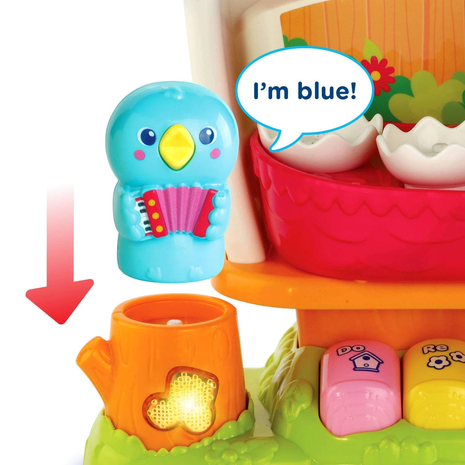 Виберіть, щоб грати в режимі навчання або музики. Більше 65 пісень, звуків і фраз включають звуки інструментів. Помістіть пташенят всередину і натискайте на барвисті кнопки, щоб побачити, як вони піднімаються і опускаються.