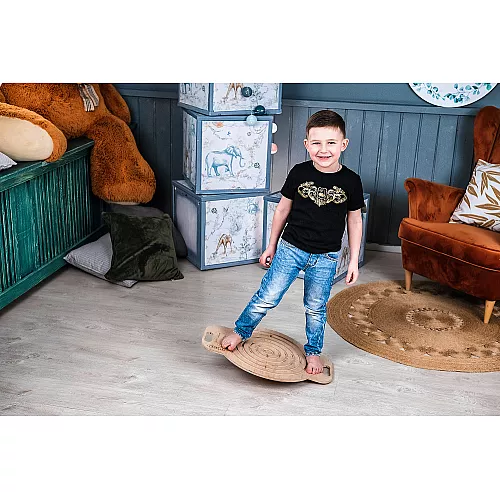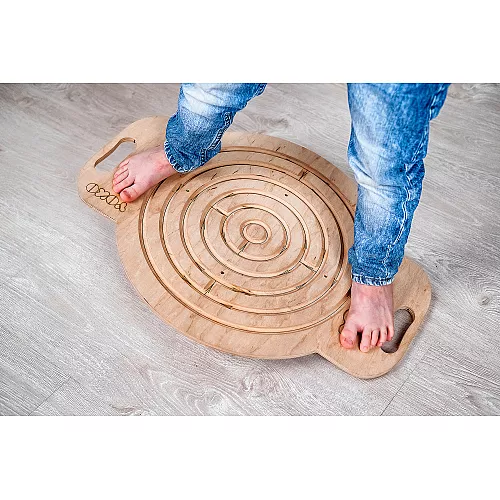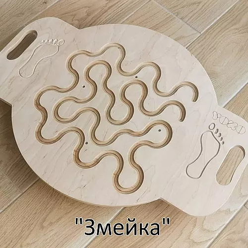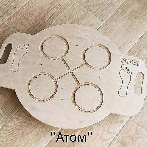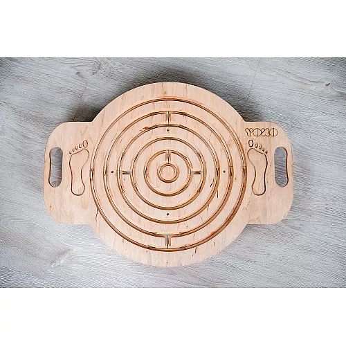 Даний балансир призначений для розвитку координації рухів, тренування вестибулярного апарату і спритності. Для концентрації уваги і більш ефективного результату можна використовувати кульки. Двома ногами потрібно ставати з боків і намагатися прокатати кульки по різьбі у вигляді малюнка. Зробити це не так просто і вимагає певних навичок. Балансир виготовлений з натурального дерева, абсолютно безпечного і екологічного матеріалу.