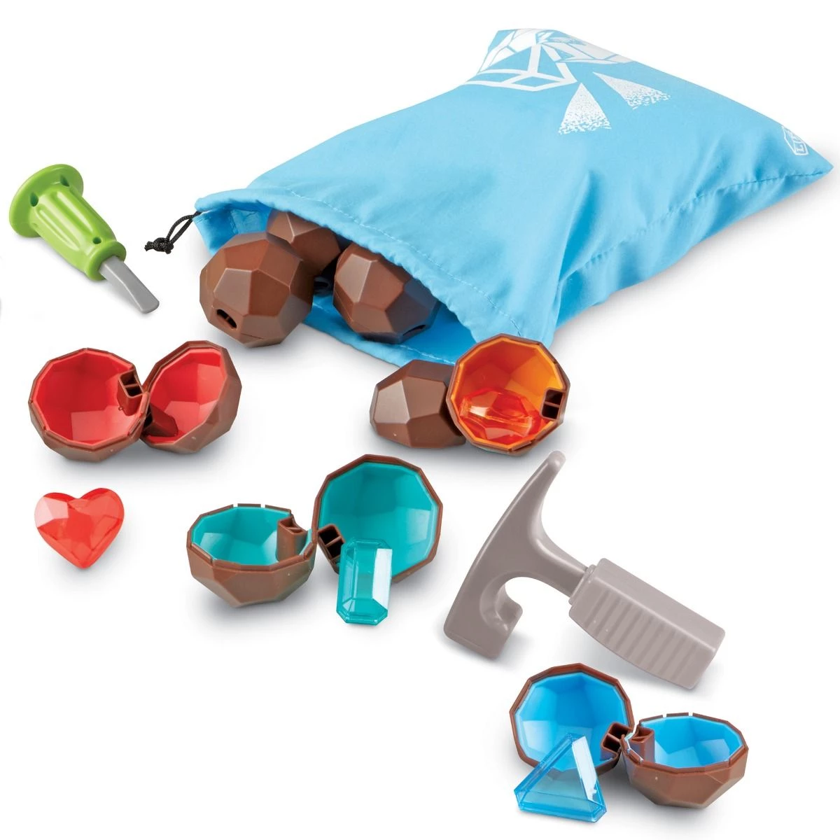 Малюкам сподобається розкривати камені і знаходити там різнокольорові блоки. Під час гри, вони вивчають сортування, зіставлення і підрахунок з ігровими геодами і дорогоцінним камінням. Використовуючи ігровий молоток і зубило, діти можуть зламати кожний геод і виявити всередині прозорі пластикові дорогоцінні камені. Дорогоцінні камені бувають восьми різних кольорів і чотирьох різних форм - ви можете знайти червоне серце, пурпурний трикутник, зелений діамант або більш кумедні комбінації. Знайомить дітей з ранніми концепціями STEM і геології. Геоди можна розкривати і знову з'єднувати, починаю гру заново. У наборі йде зручний мішечок для зберігання.