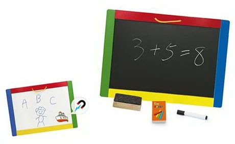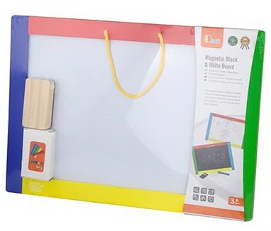 Зручна магнітна дошка з дерев'яним каркасом, на якій можна малювати маркером і крейдою. Двостороння дошка виконана з екологічного матеріалу і не викликає алергію. Одна сторона дошки магнітна, друга - чорна, щоб малювати або писати крейдою. Дошка компактна, легко складається.