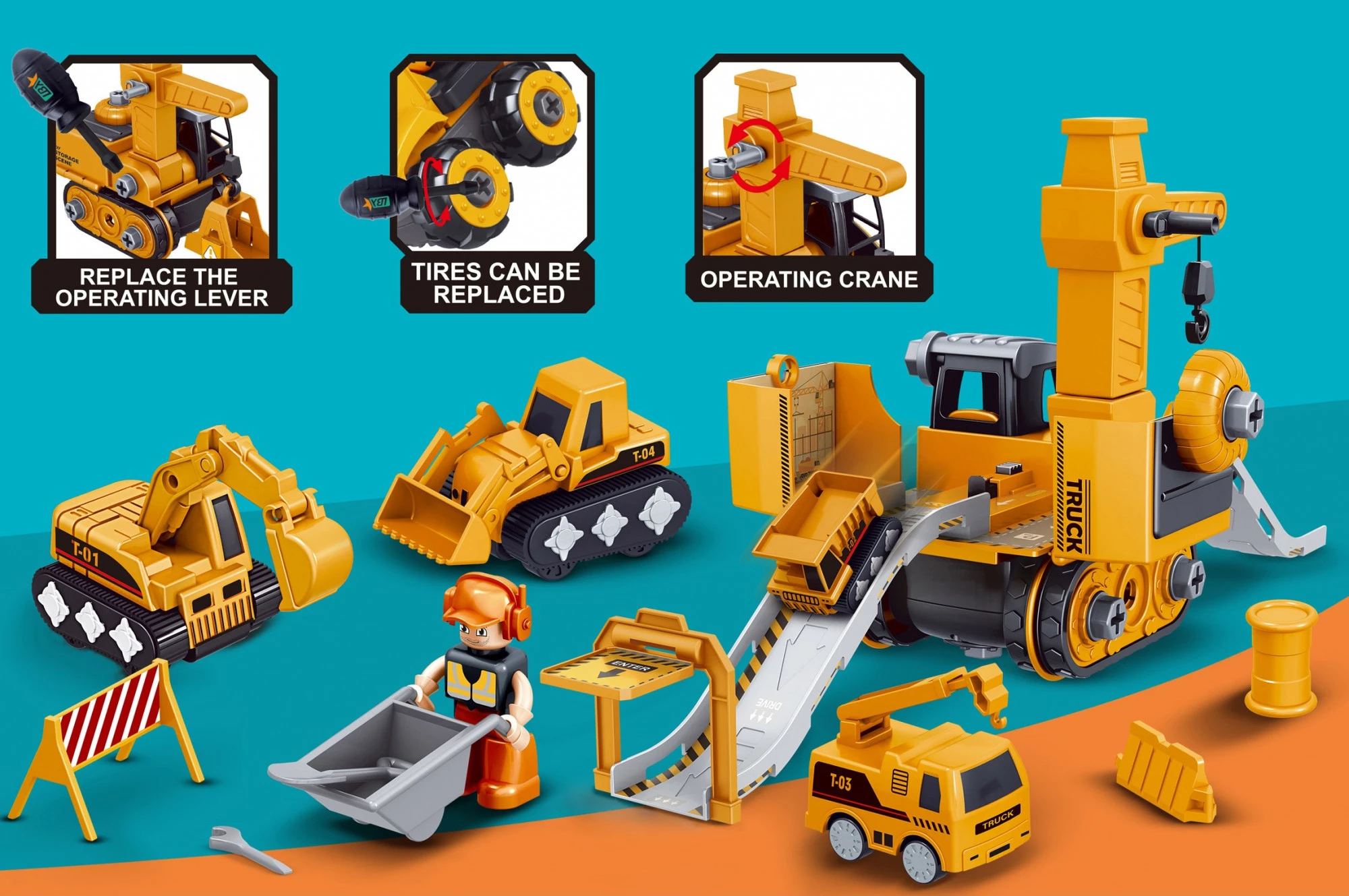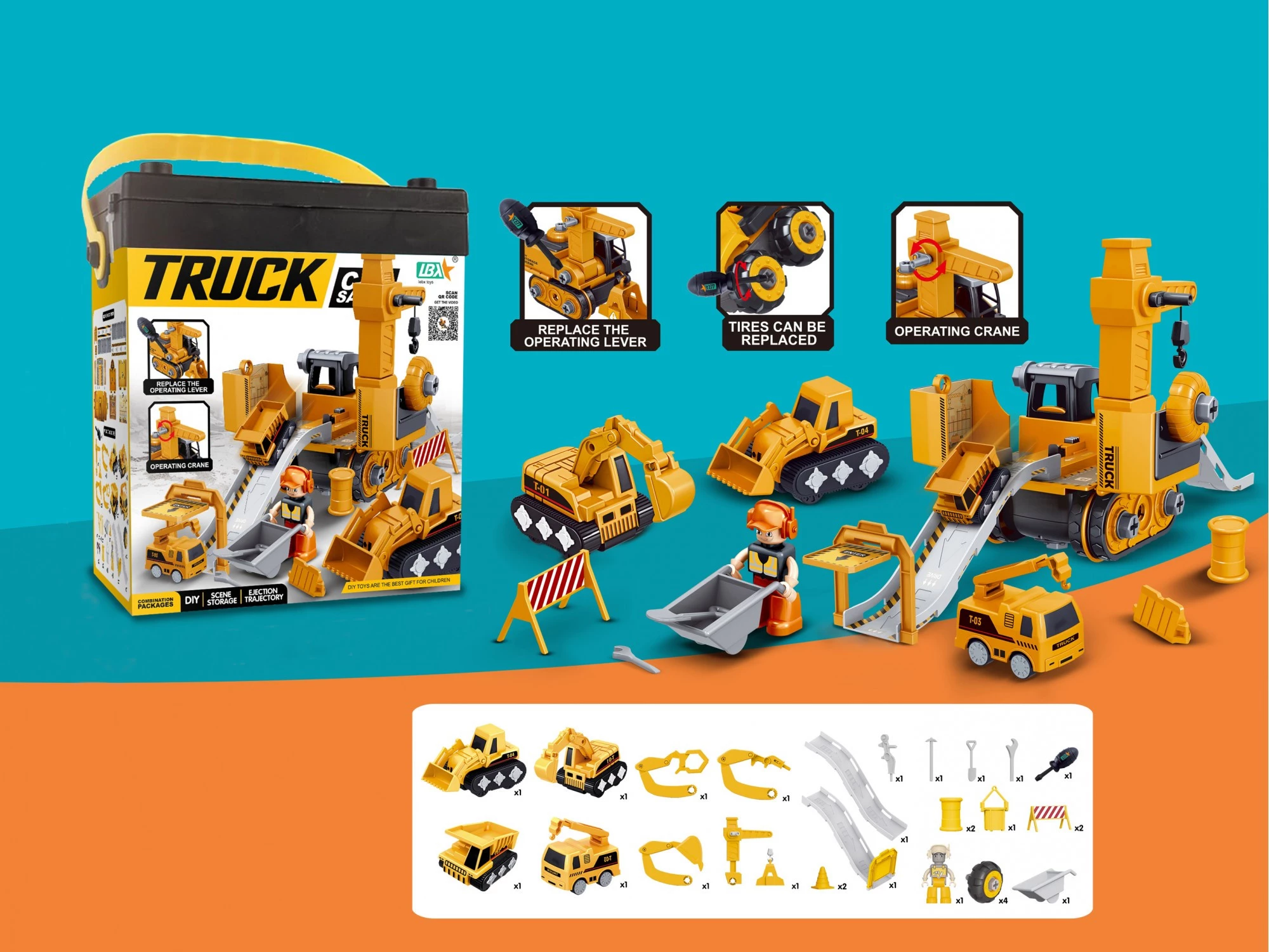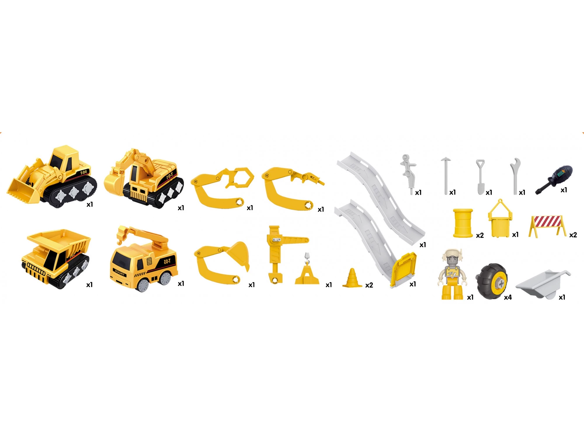 Цей ігровий набір – чудовий подарунок для маленьких автолюбителів! Він стане гідним поповненням дитячої колекції будівельної техніки. Тепер ваш фантазер зможе придумати ще більше веселих та цікавих ігор на будівельну тематику. Комплект включає самоскид з рухомим кузовом, який підійде для перевезення всіляких сипучих вантажів, бульдозер, підйомний кран та екскаватор. До послуг дитини справжнісінька будівельна автобаза! Основу набору складає всюдихід з гіркою, який зробить дитячі ігри ще цікавішими. Ігровий комплект познайомить малюка з новими транспортними засобами, а батьки зможуть розповісти йому про призначення того чи іншого автомобіля, що входить до набору. Це дозволить розширити кругозір хлопчика та поповнити словниковий запас.