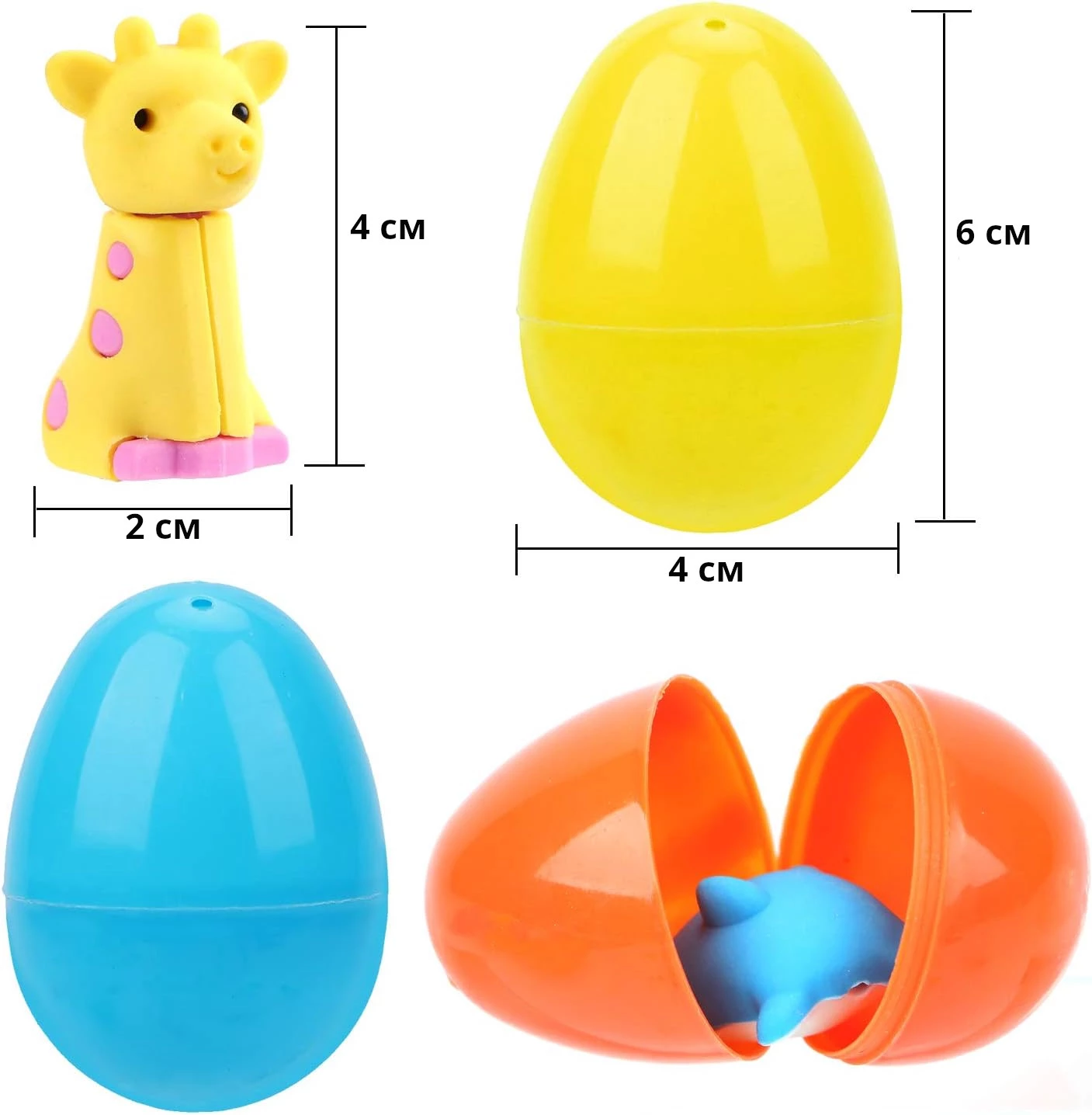 Смішні гумові фігурки в різнокольорових пластикових яйцях – чудовий великодній подарунок! Чарівні та яскраві звірятка стануть гідним поповненням дитячої колекції фігурок та із задоволенням візьмуть участь у дитячих забавах. Кожне яйце містить двох милих звірят. Фігурки можна використовувати як ластики, а також для повсякденних ігор або для прикраси інтер'єру. Вони обов'язково сподобаються і дітям, і дорослим.