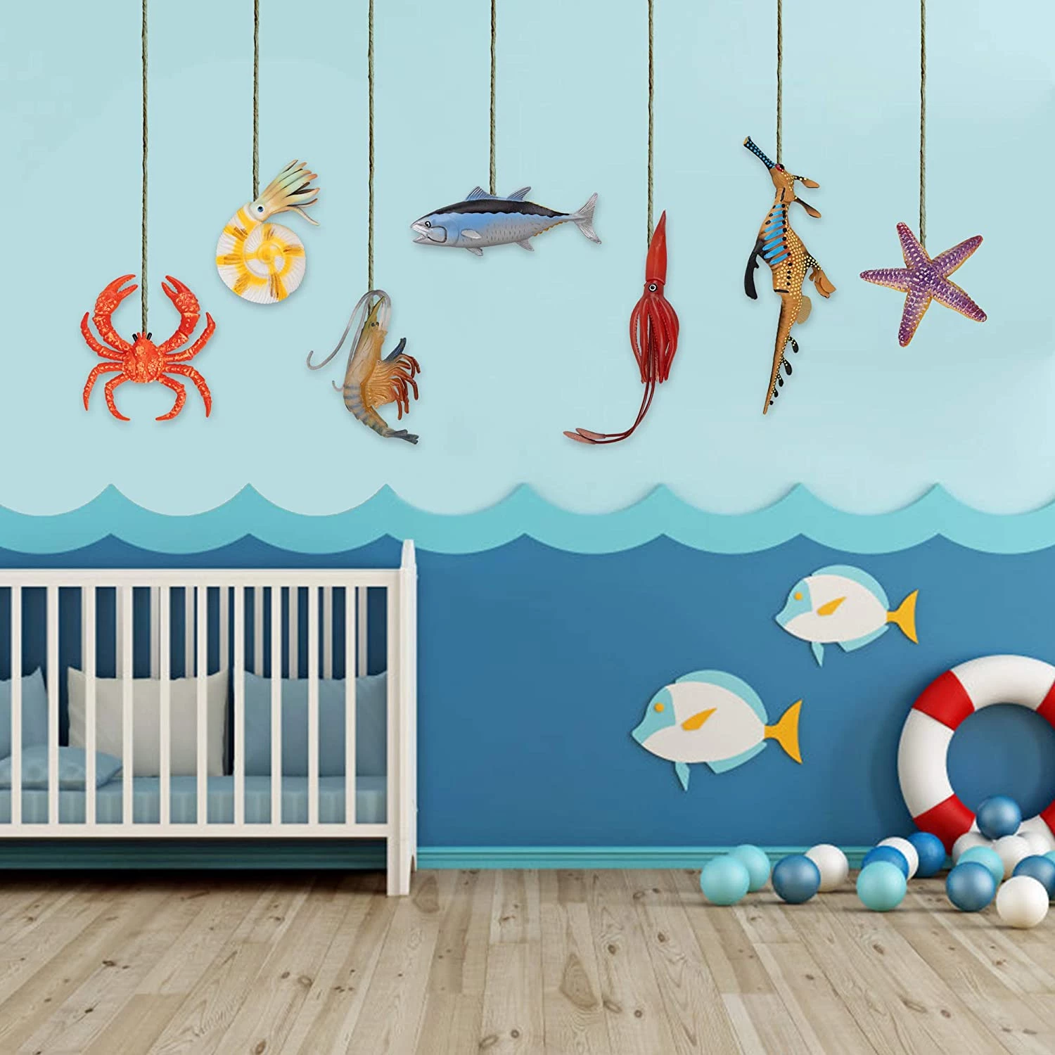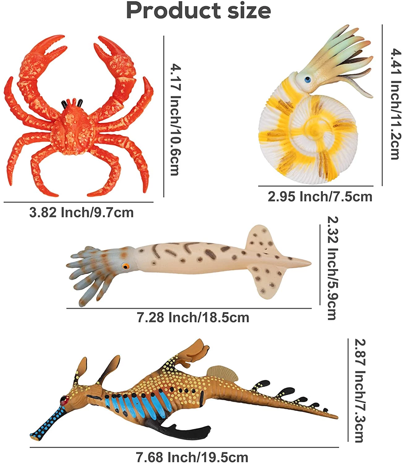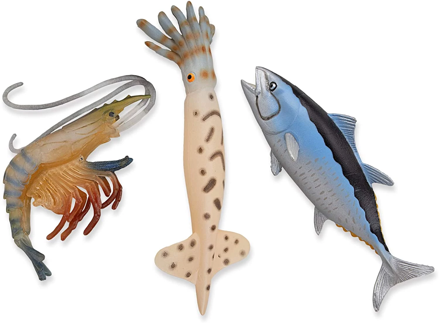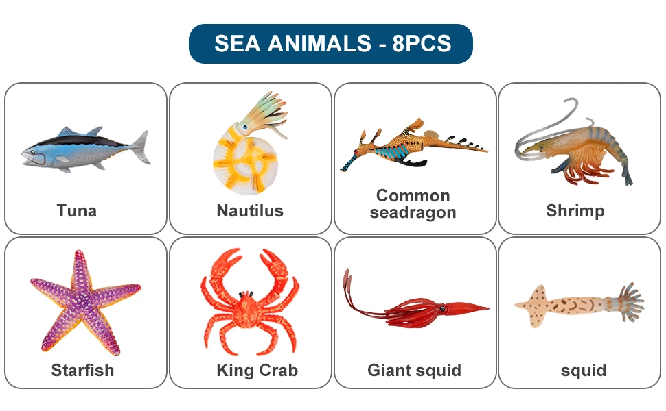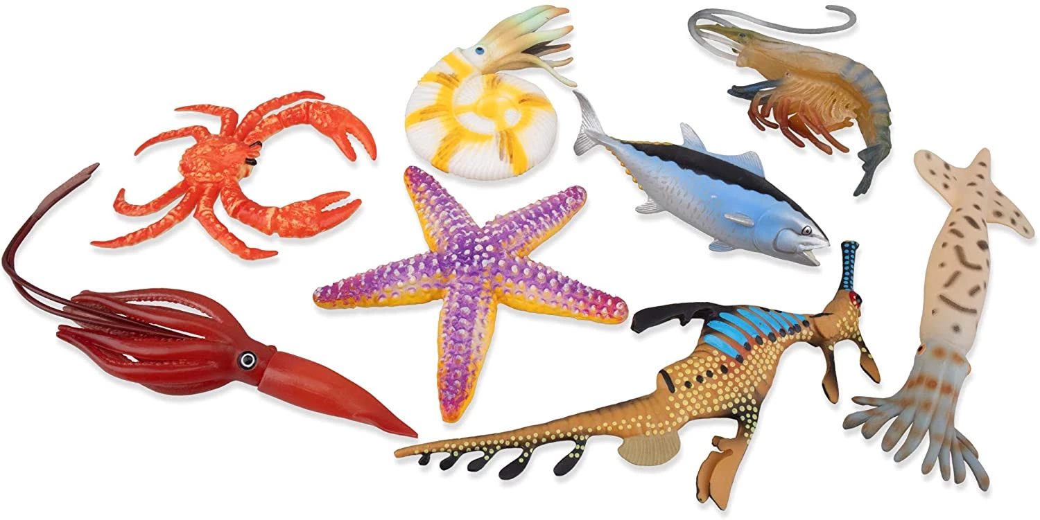 Набір з морських жителів прекрасно підійде для прикраси акваріума, колекціонування або ігор у воді. Кожна фігурка має реалістичну промальовування і приємну текстуру. Вони виконані з гіпоалергенного довговічного матеріалу. У комплекті є Королівський краб, тунець, Морська зірка, креветки і багато інших мешканців морських глибин. Комплект можна використовувати для демонстраційних цілей на уроках біології.