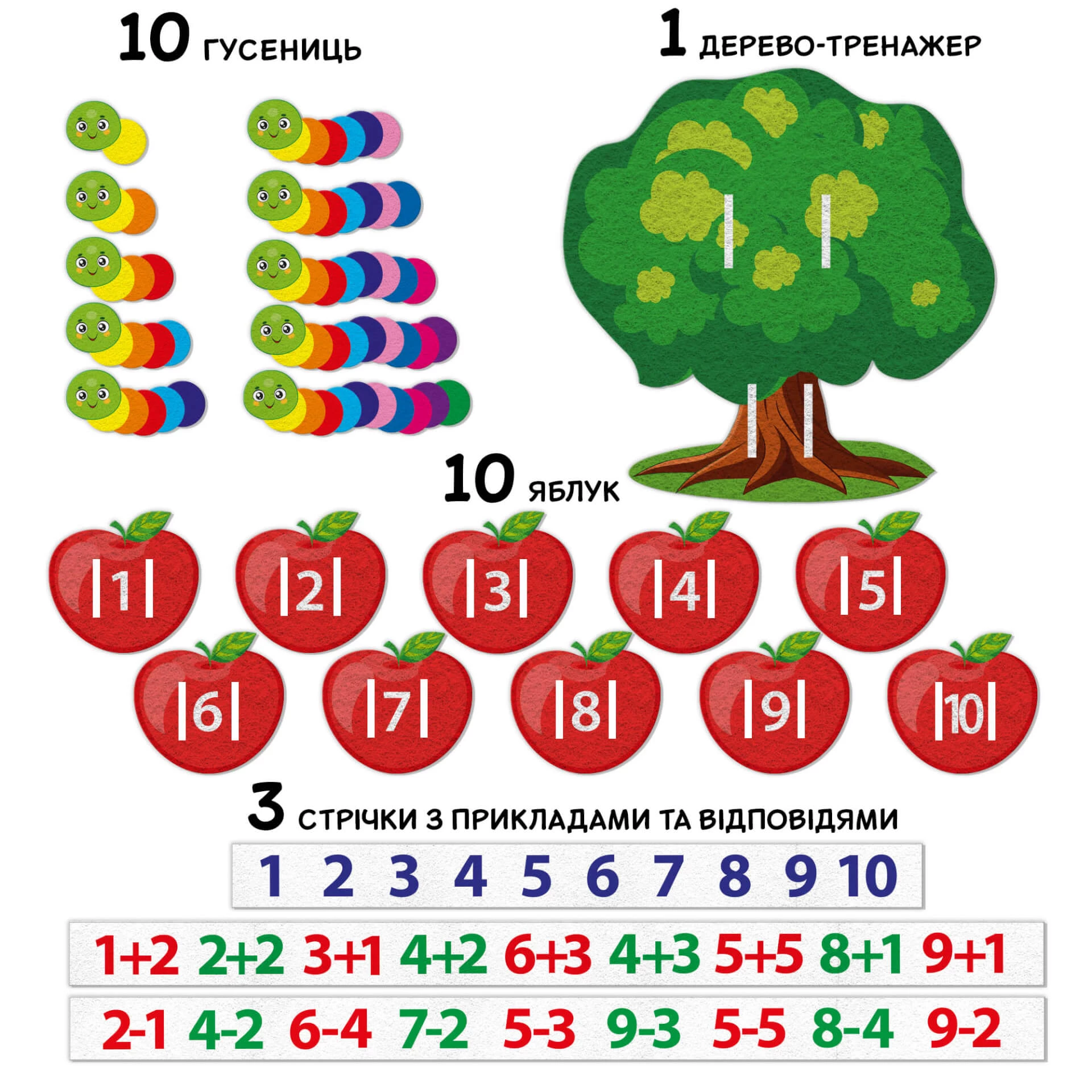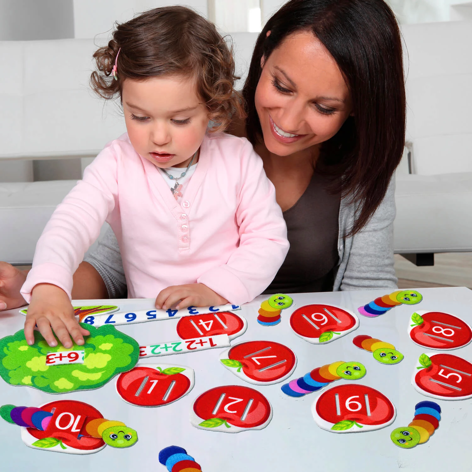 Ця гра 2 в 1 - корисний подарунок для дітей віком від 3 років. Гра з м'якими деталями з фетру цікава, весела та динамічна. Набір включає 10 яблук і 9 гусениць. Граючи, дитина навчиться швидко рахувати вперед і назад, розрізняти кольори, зіставляти числа та цифри та познайомиться з поняттями «довше» та «коротше». Крім того, гра сприяє розвитку дрібної моторики, пам'яті та уваги.