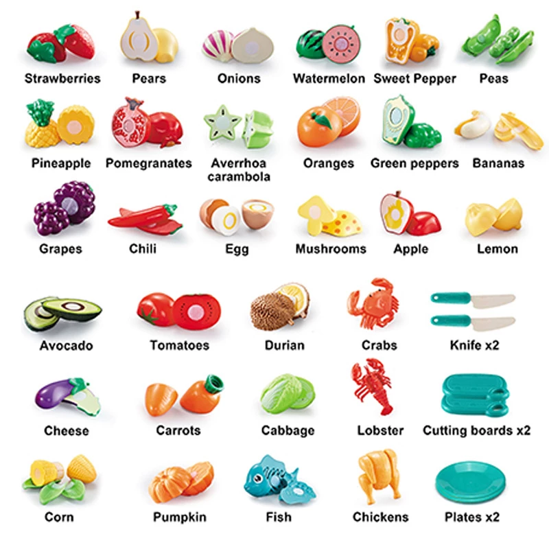 Яскравий реалістичний набір фруктів і овочів. Всі продукти можна розрізати додається іграшковим ножем на окремі частини. Виготовлені з безпечних і екологічно чистих матеріалів, дизайн із закругленими краями забезпечить максимальну безпеку для дітей.