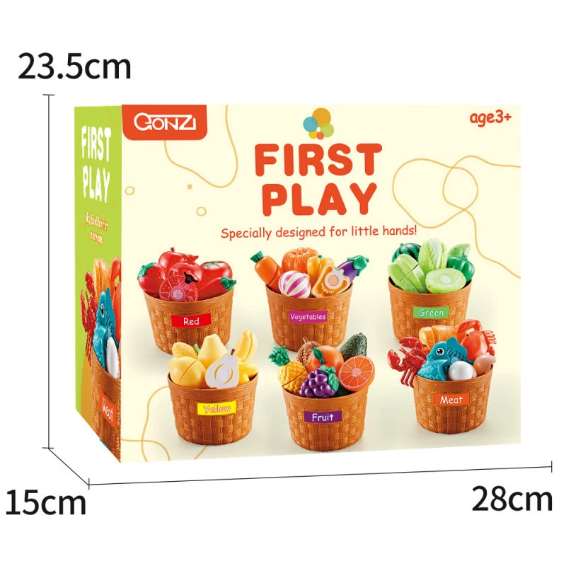 Відсортуйте фрукти і овочі за кольором. Помістіть продукти в кошики відповідного кольору. Спростіть сортування, почавши з двох кольорів. Коли діти стануть більш впевнено сортувати два кольори, додайте ще один колір. Коли ваша дитина освоїть сортування за кольором, спробуйте сортувати ігрові продукти по фруктам і овочам. Для додаткових можливостей сортування напишіть кольори на доданих наклейках і нанесіть їх на відповідний кошик.