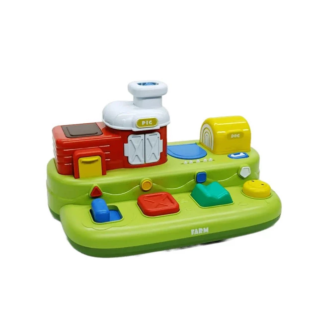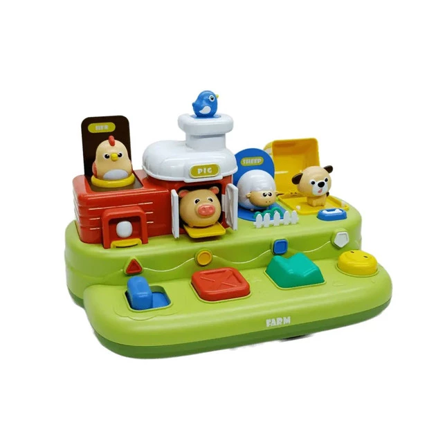 Навчальна логічна іграшка оснащена чотирма кнопками, які потрібно натискати, перемикати або повертати, аби відкрити будиночки, в яких ховаються курочка, свинка, овечка та собачка.