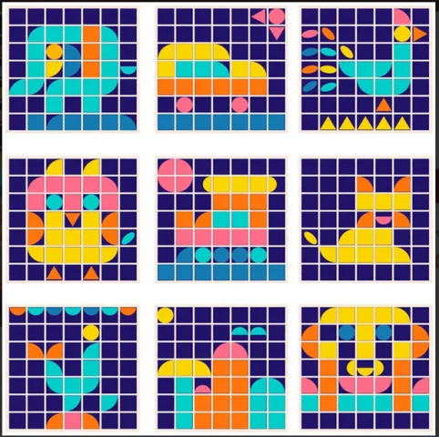 - деталі у вигляді геометричних фігур 5-ти кольорів (рожевий, блакитний, синій, помаранчевий, жовтий) - 169 шт.