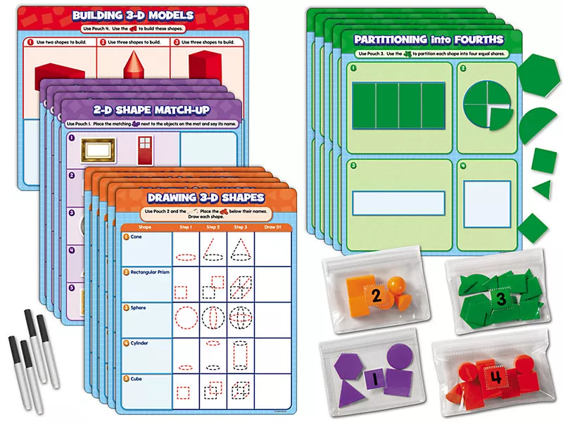 У наборах представлені різноманітні об'ємні геометричні фігурки. Це допомагає дітям впізнавати та розрізняти різні форми – кулі, трикутники, квадрати, ромби та багато інших. Кожна фігурка часто має свій унікальний колір, що розвиває здатність розпізнавати та класифікувати об'єкти за їх характеристиками. Деякі елементи мають невеликі магніти, які дозволяють дітям поєднувати елементи між собою та створювати об'ємні композиції.