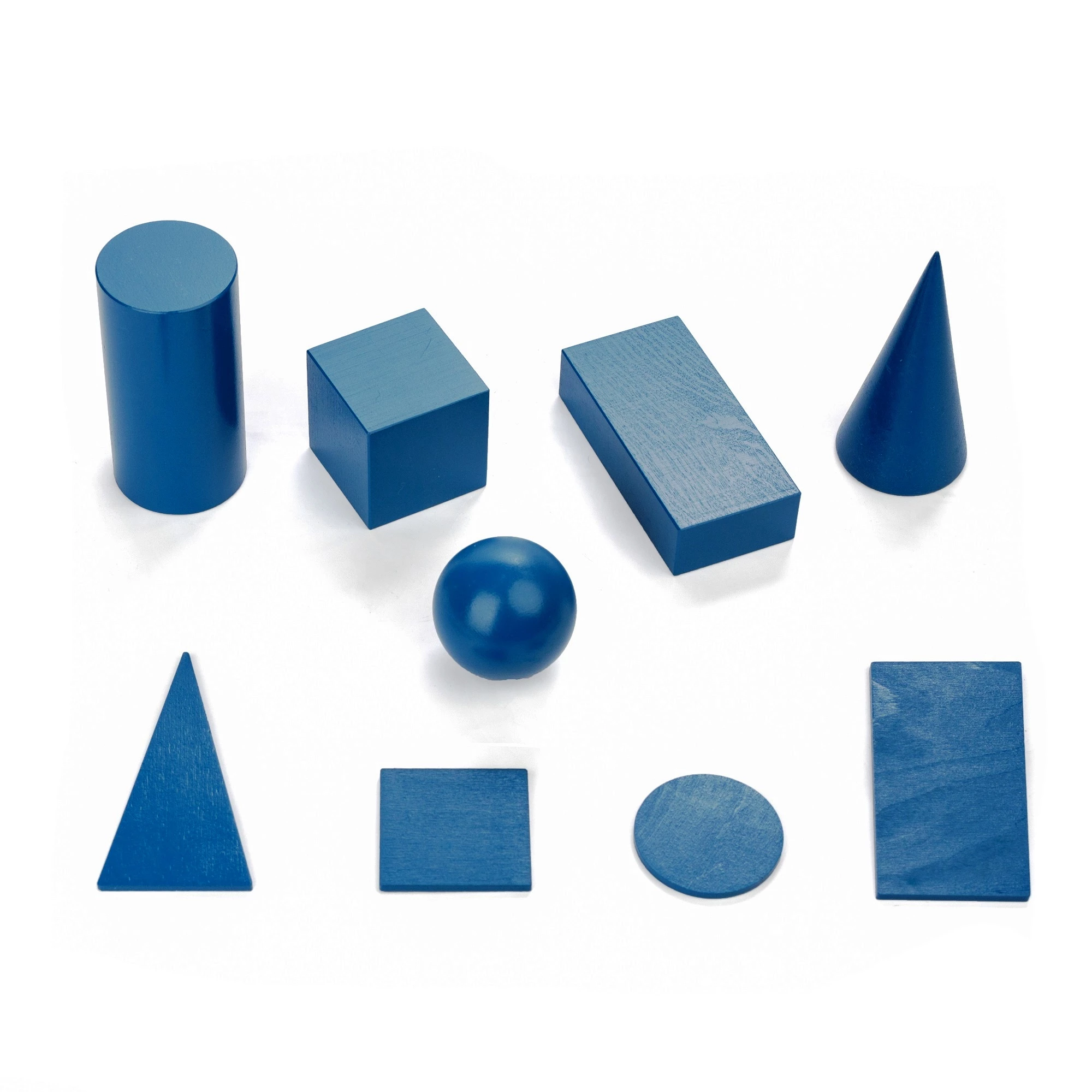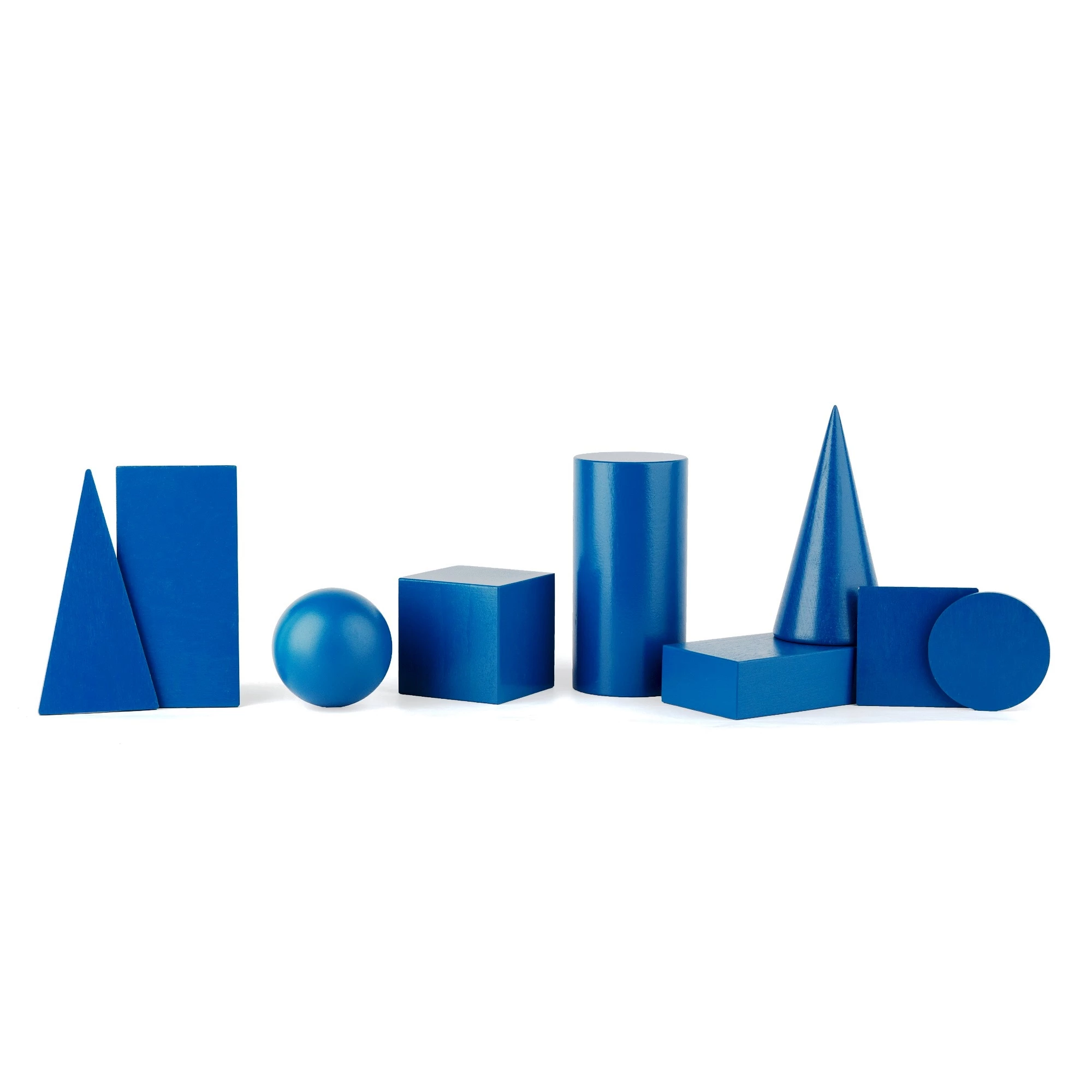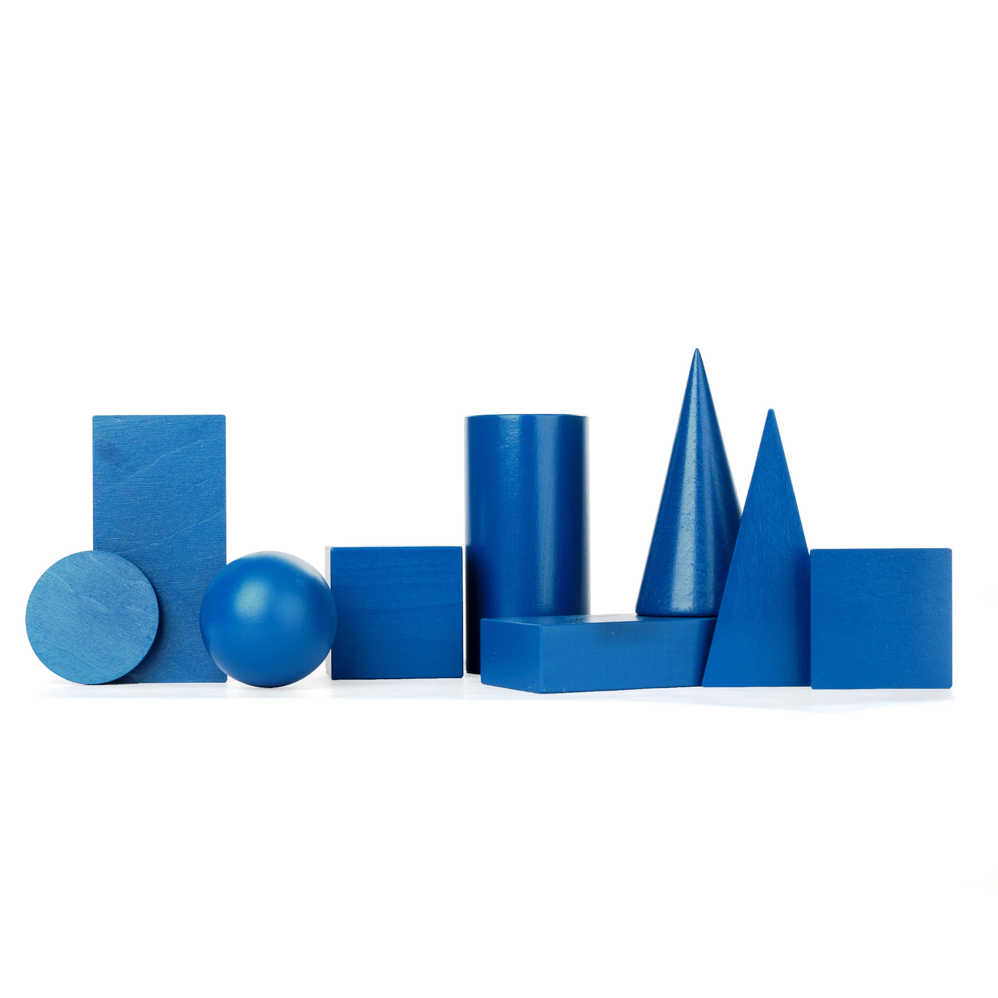 Демонстраційний набір геометричних тіл і фігур включає 9 елементів: 5 тіл і 4 фігури. Предмети виготовлені з натуральної деревини та пофарбовані у яскравий синій колір нетоксичними фарбами європейської якості на водній основі. Даний набір допомагає у вивченні геометричних тіл та фігур, їх особливостей, а також характеристик.