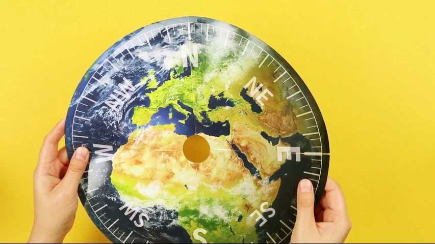 Через великі габарити компаса для початку його роботи знадобиться декілька хвилин. На звороті шаблону знаходиться принт із зображенням Землі.