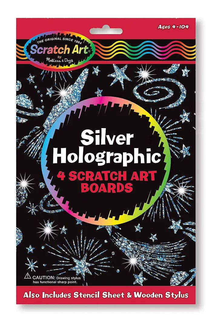 Порадуйте дитину цікавим подарунком — набором для творчості Голографічна царапка-трафарет від Melissa & Doug. Цей ігровий комплект забезпечить маленьким фантазерам цікаве та корисне проведення часу.