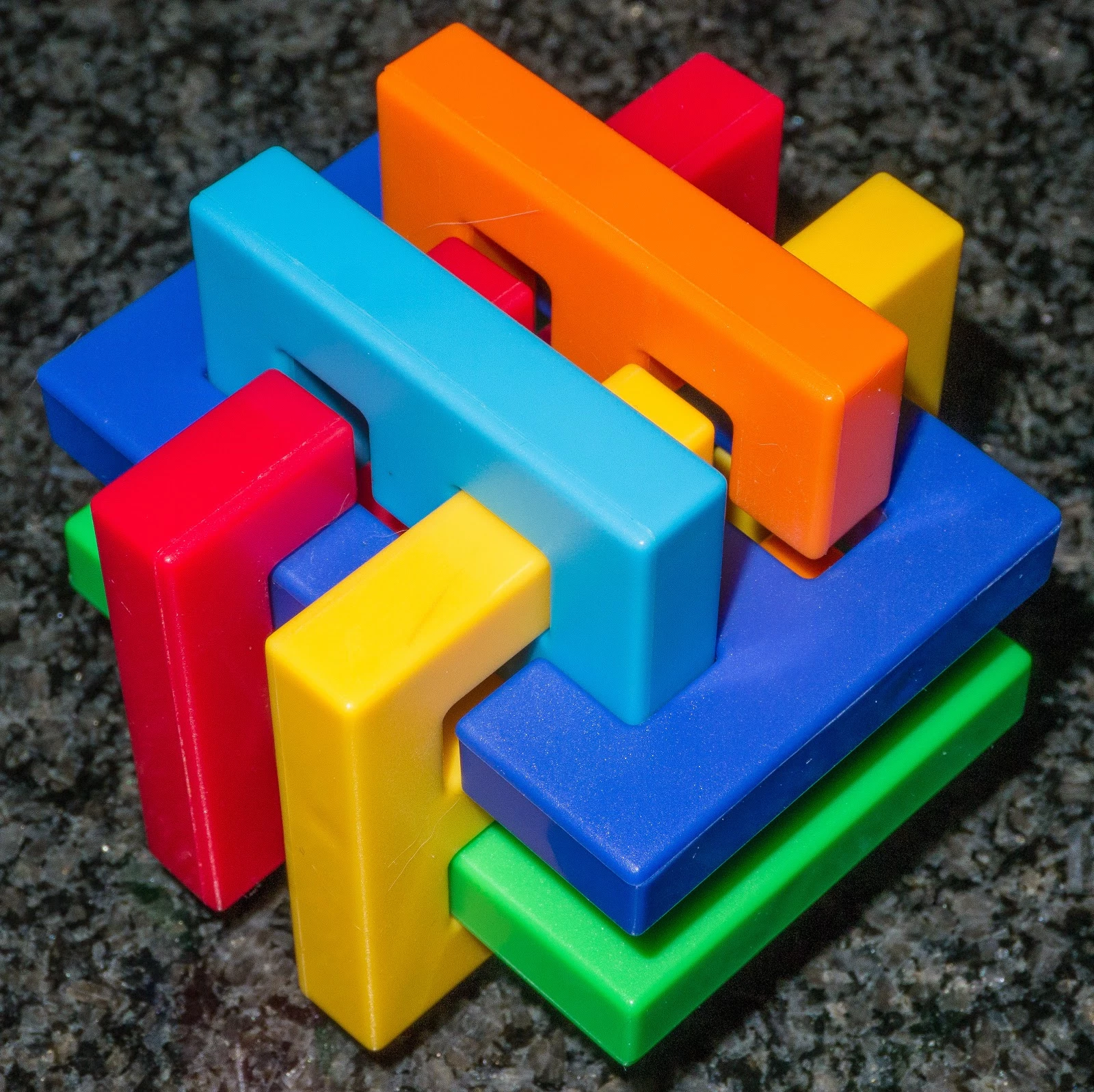 - 6 барвистих взаємопов'язаних частин головоломки.
