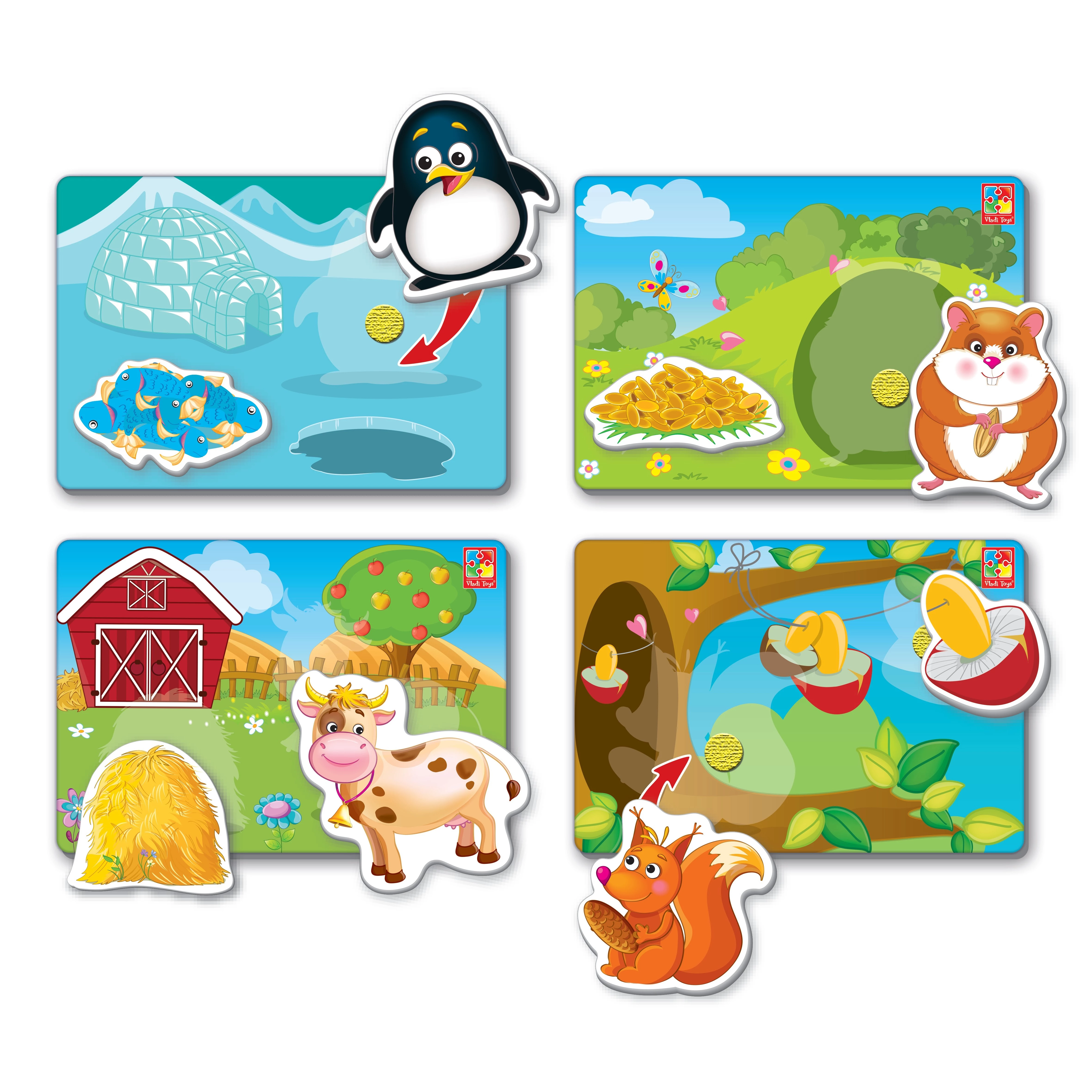 За допомогою липучок прикріпіть тварин до тих карток, на яких зображено їхнє житло. Наприклад, курочка мешкає на фермі, а білка мешкає на дереві. Ваше завдання - прикріпити відповідні фігурки на ігрові поля.