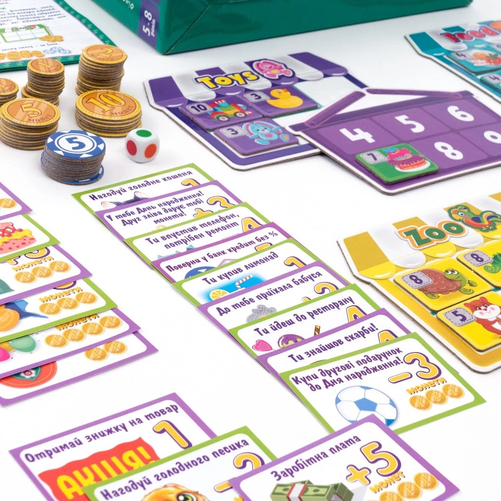 Кожен гравець є власником магазинчика. Заробляй гроші, продавай і купуй, наповнюй продуктовий кошик швидше за інших і перемагай. Кидай кубики і виконуй завдання, які тобі випадуть.
