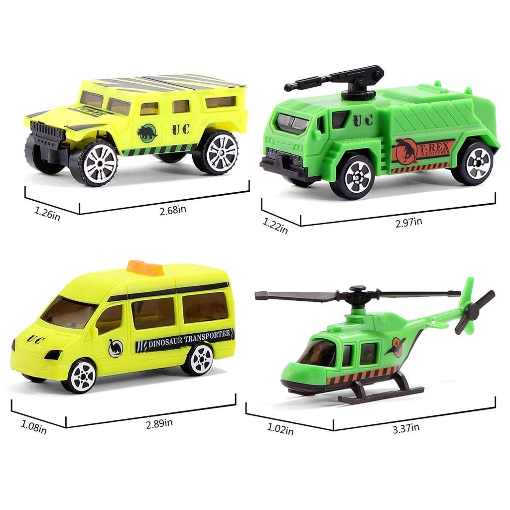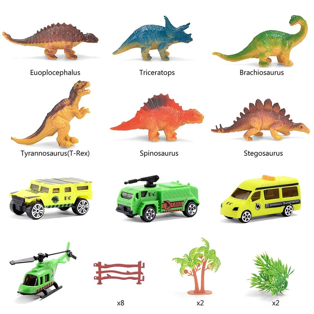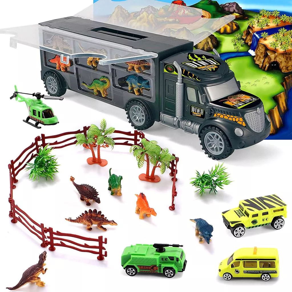 У цьому незвичайному набору перевізника є шість реалістичних маленьких динозавра, чотири машинки, паркани, трава, дерева і вертоліт. Цей захоплюючий набір допоможе вашій дитині пірнути в дивовижну гру і дати волю своїй уяві. Висока якість кожної іграшки, заслуговує на довіру і зможе служити вашій дитині, поки малюк цього хоче. Приємний і яскравий дизайн приверне увагу. Цю іграшку зручно носити з собою на вулицю, всі маленькі машинки і динозаври легко поміщаються в велику машину, що досить зручно і економить місце.