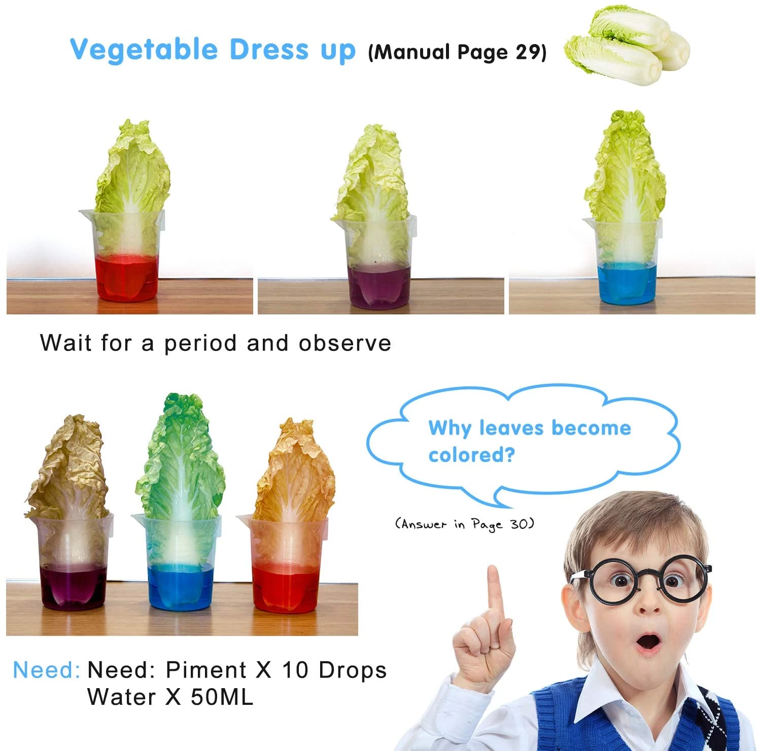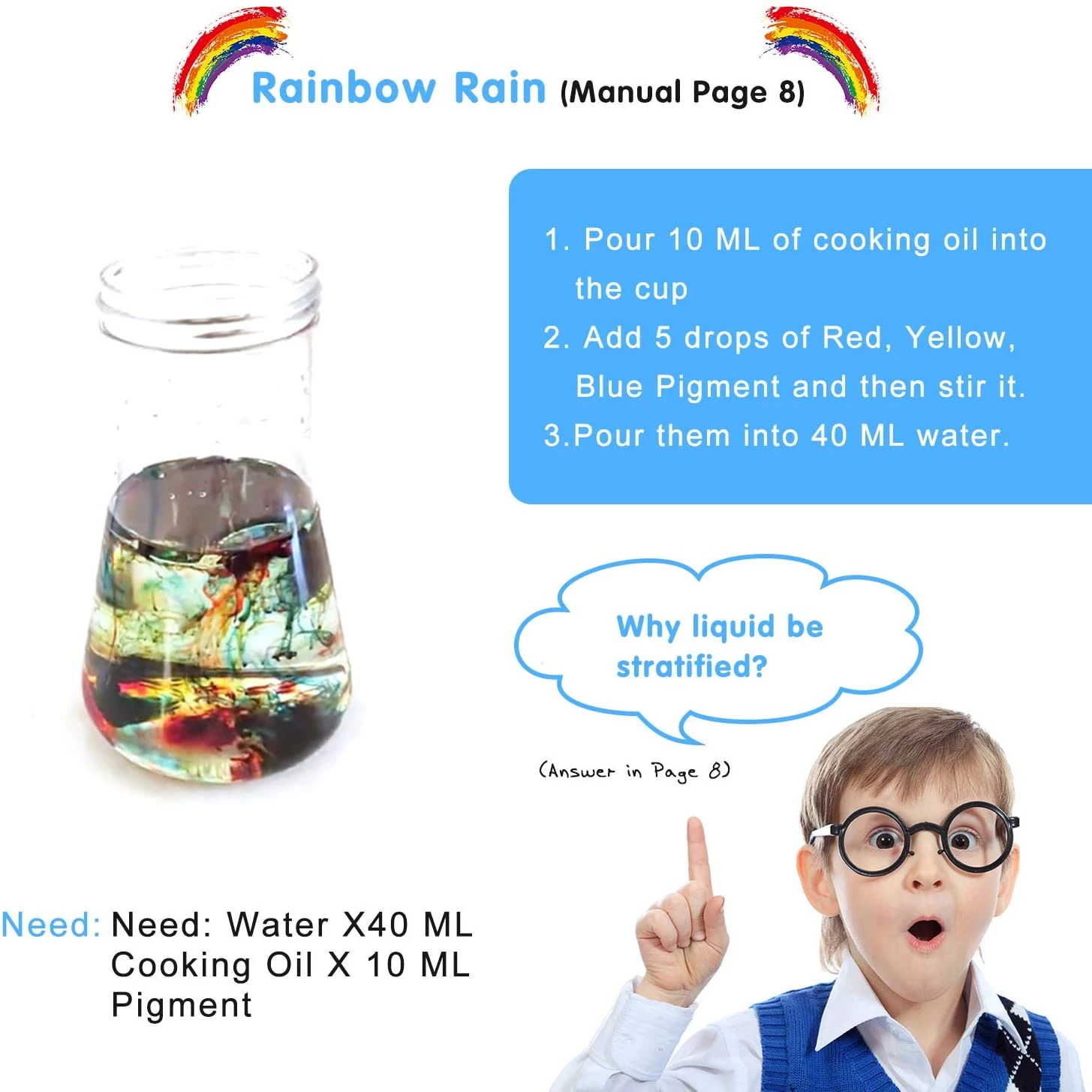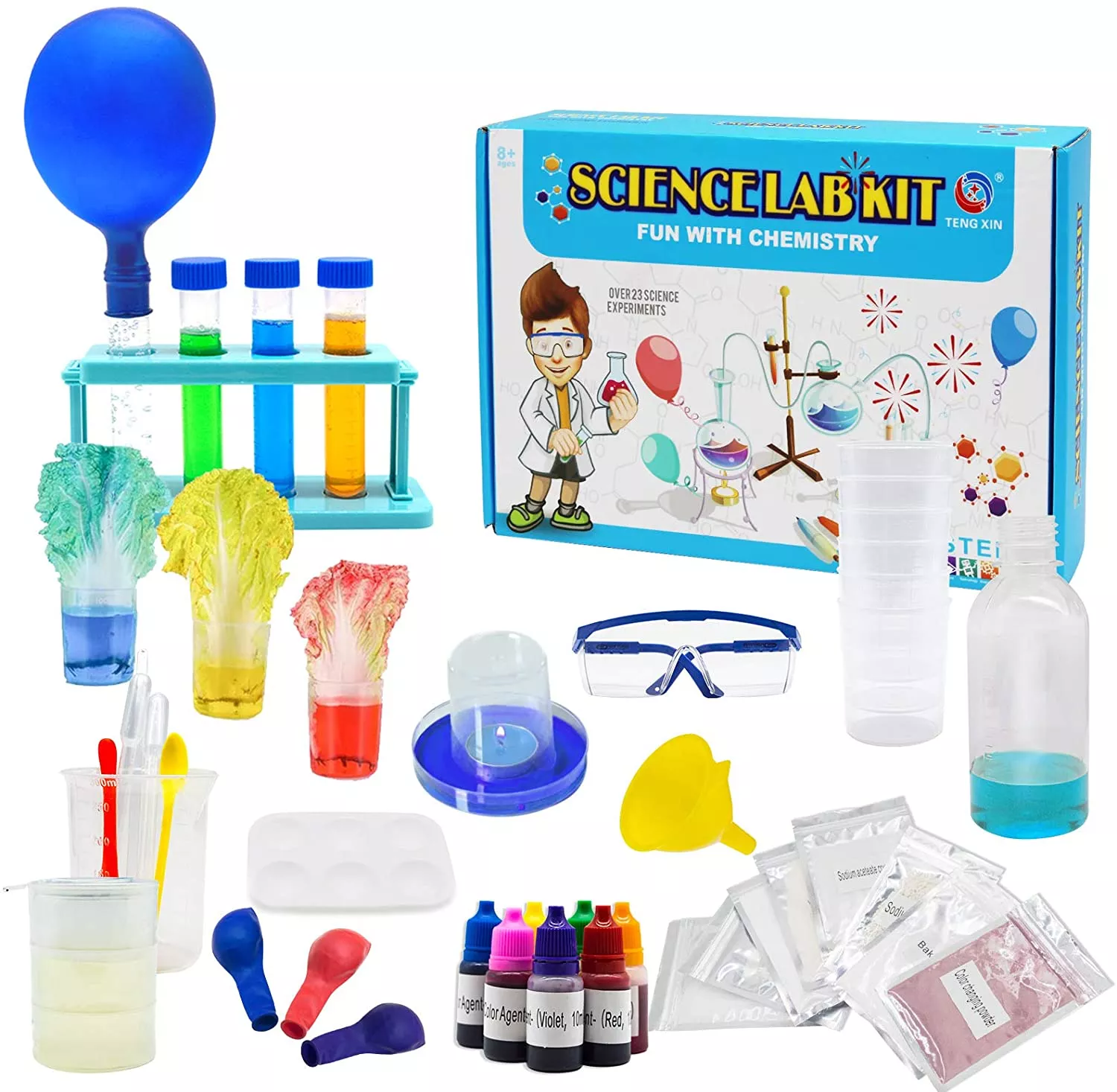 Різні експерименти допомагають дітям краще зрозуміти хімічний світ. В інструкціях докладно описані 5 фантастичних експериментальних тем, в тому числі стратифікація рідини, діоксид вуглецю, кислотно-лужна реакція, капілярний феномен, магія науки про воду та багато іншого. Більше 32 наукових експериментів. Набір для хімічного експерименту містить різноманітне експериментальне обладнання і матеріали, які можуть допомогти учням отримати задоволення від експериментів в школі або вдома.