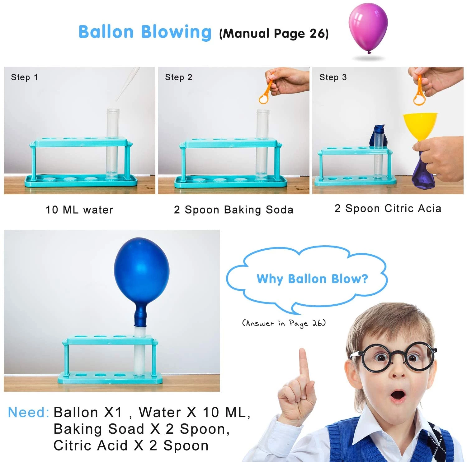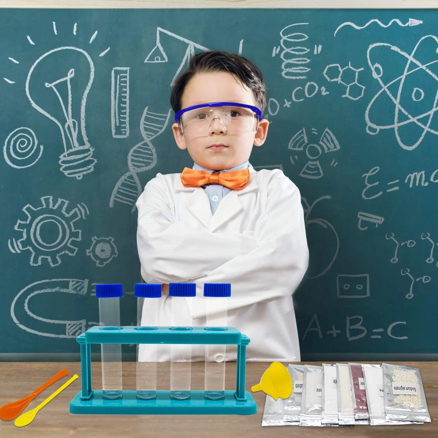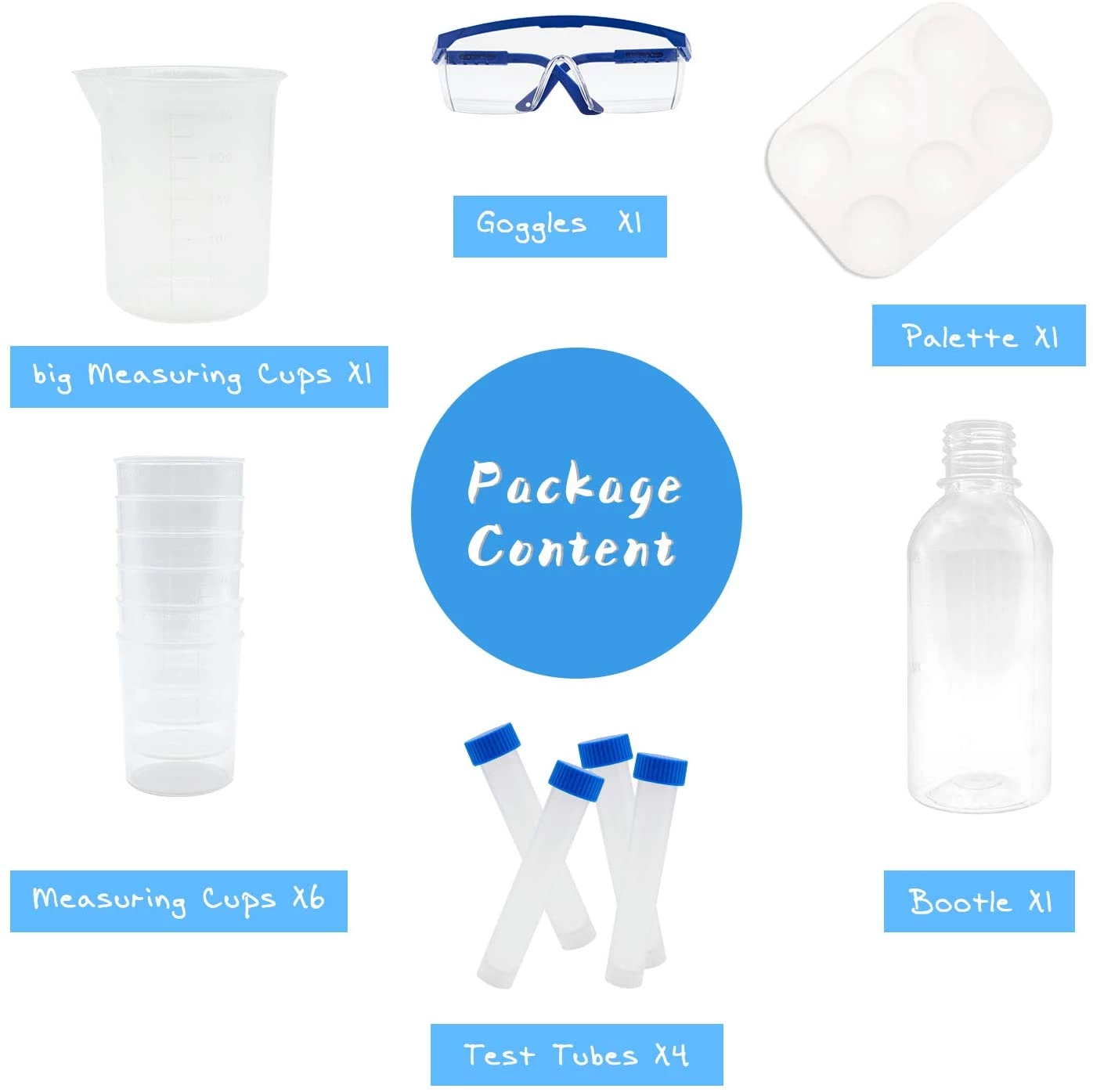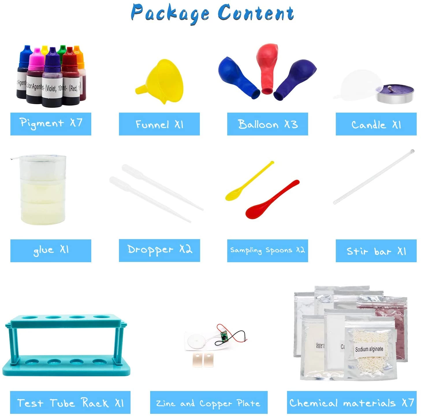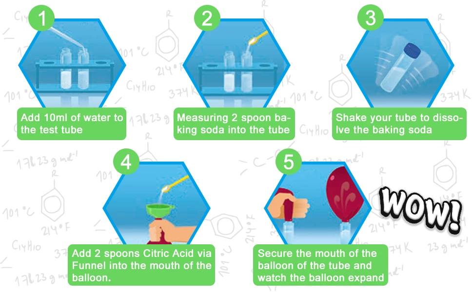 Набір включає в себе все обладнання, необхідне для проведення експерименту, в тому числі пробірку, тримач для пробірок, захисні окуляри, мірну чашку, крапельницю і так далі. Він також містить велику частину матеріалів, необхідних для експерименту. Інші матеріали, які необхідно надати, вказані в інструкції. Зверніть увагу, що всі експерименти слід проводити в присутності дорослих.