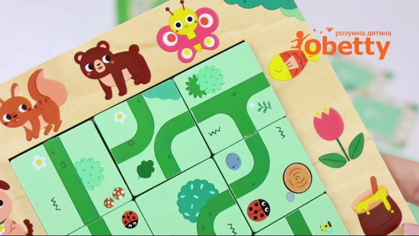 Ця головоломка має унікальний дизайн. Дітям потрібно пересувати її частини, щоб тварини знайшли правильний маршрут для пошуку їжі. Гра тренує у дітей навички мислення та спостережливість. Також головоломка сприяє розвитку у дітей навичок мислення та спостереження, прищеплює здатність самостійно вирішувати проблеми, тренує дрібну моторику.