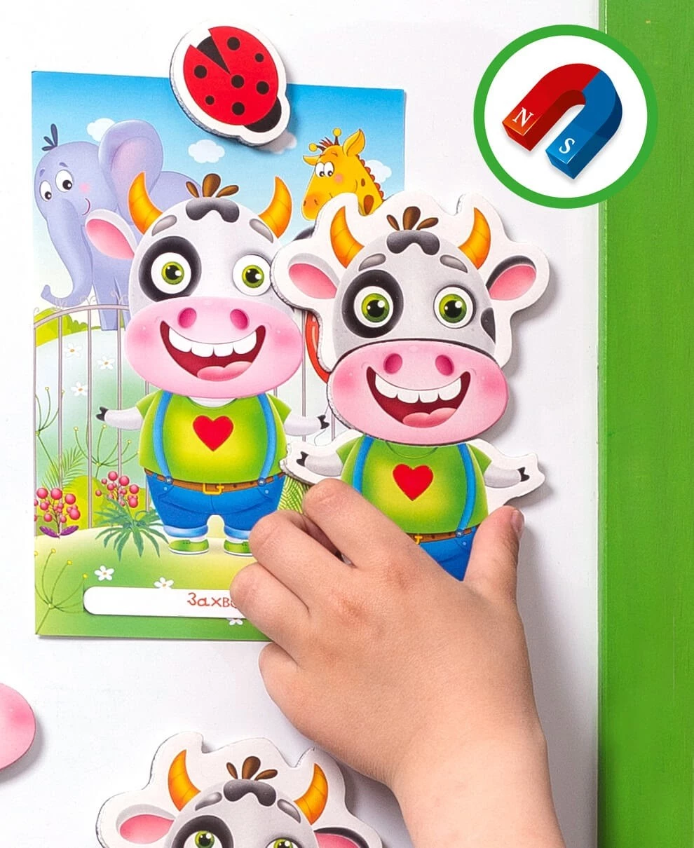 Припустимо, наш Боббі вирішив відвідати зоопарк. Він у захваті від зустрічі з різними звірятками. Вам треба знайти магніт, який передавав би цю емоцію (радість). Даній емоції відповідають магнітики з посмішкою та широко розкритими очками. Беремо їх, доповнюємо основою і складаємо обличчя Боббі. Готово!